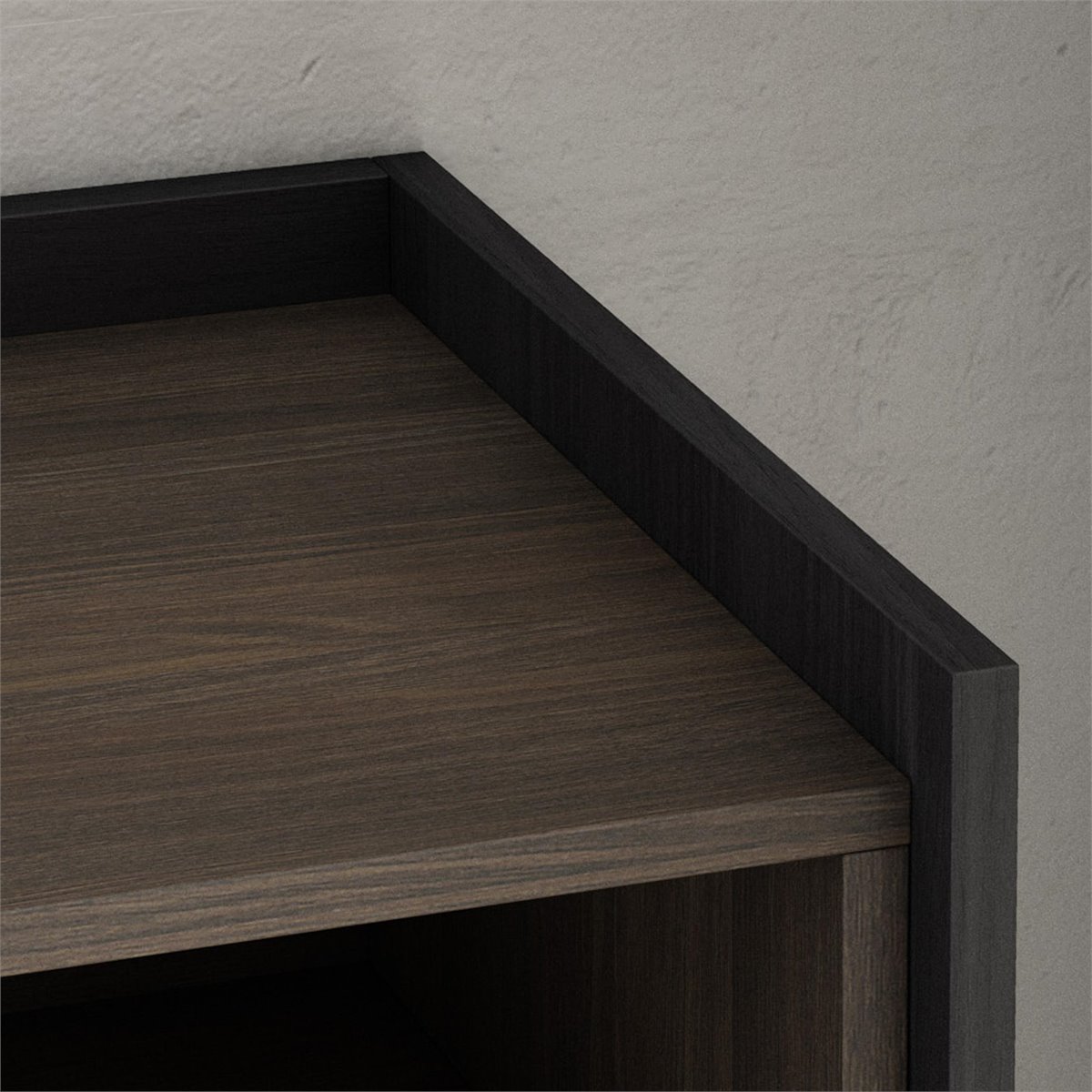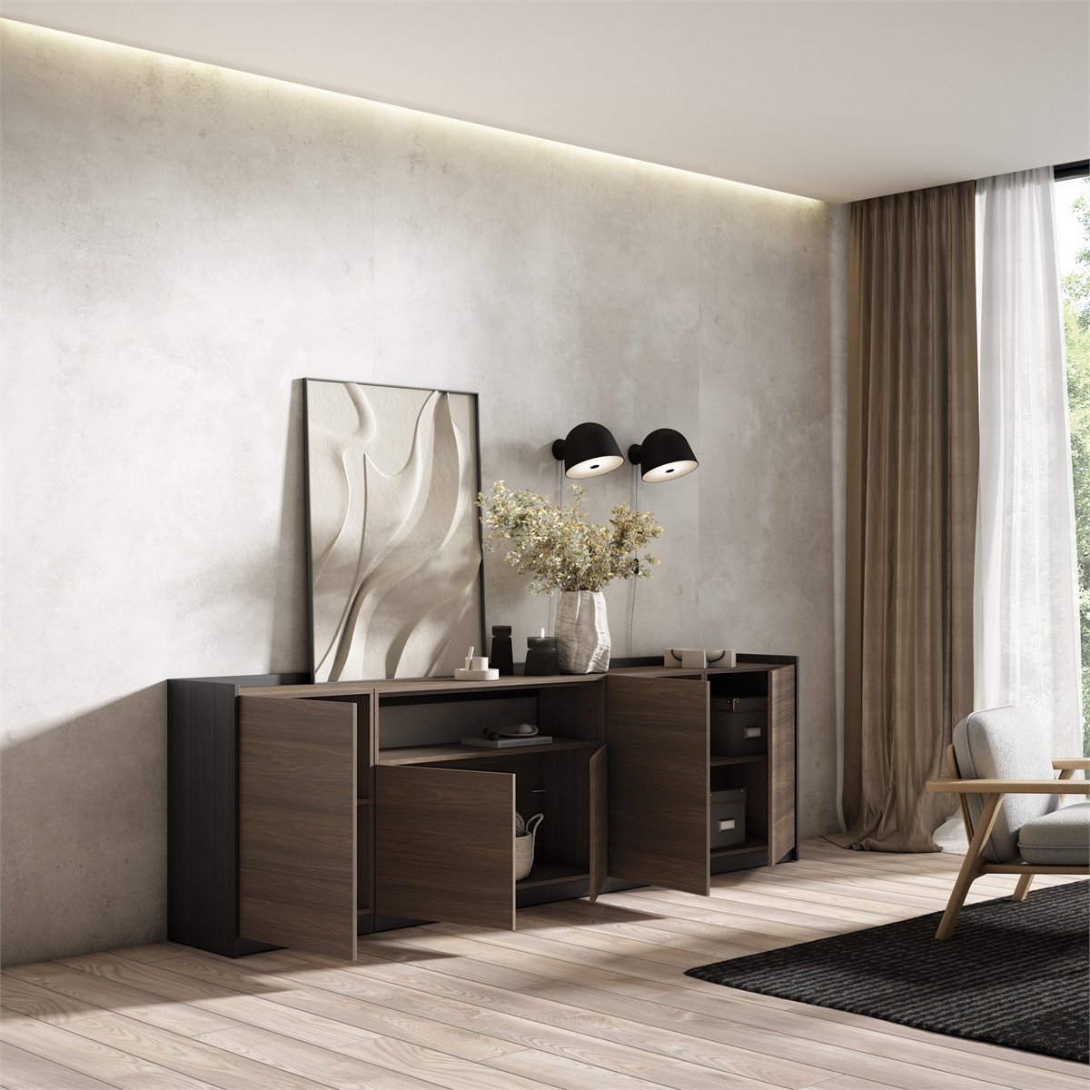 Módulo con 2 puertas, gran capacidad de almacenamiento. Medidas del Módulo: 104cm. de Ancho, 80cm. de Alto, 37cm. de Profundidad. Color roble oscuro y negro con veteado de madera de tacto poroso de alta calidad.