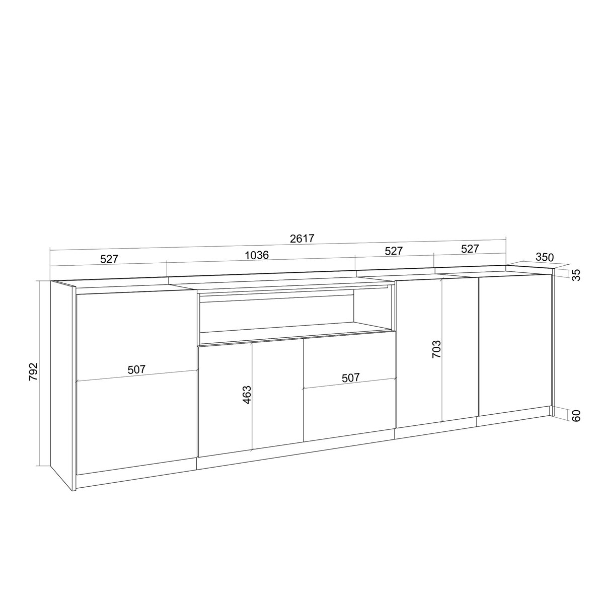 Módulo con 2 puertas, gran capacidad de almacenamiento. Medidas del Módulo: 104cm. de Ancho, 80cm. de Alto, 37cm. de Profundidad. Color negro y roble con veteado de madera de tacto poroso de alta calidad.