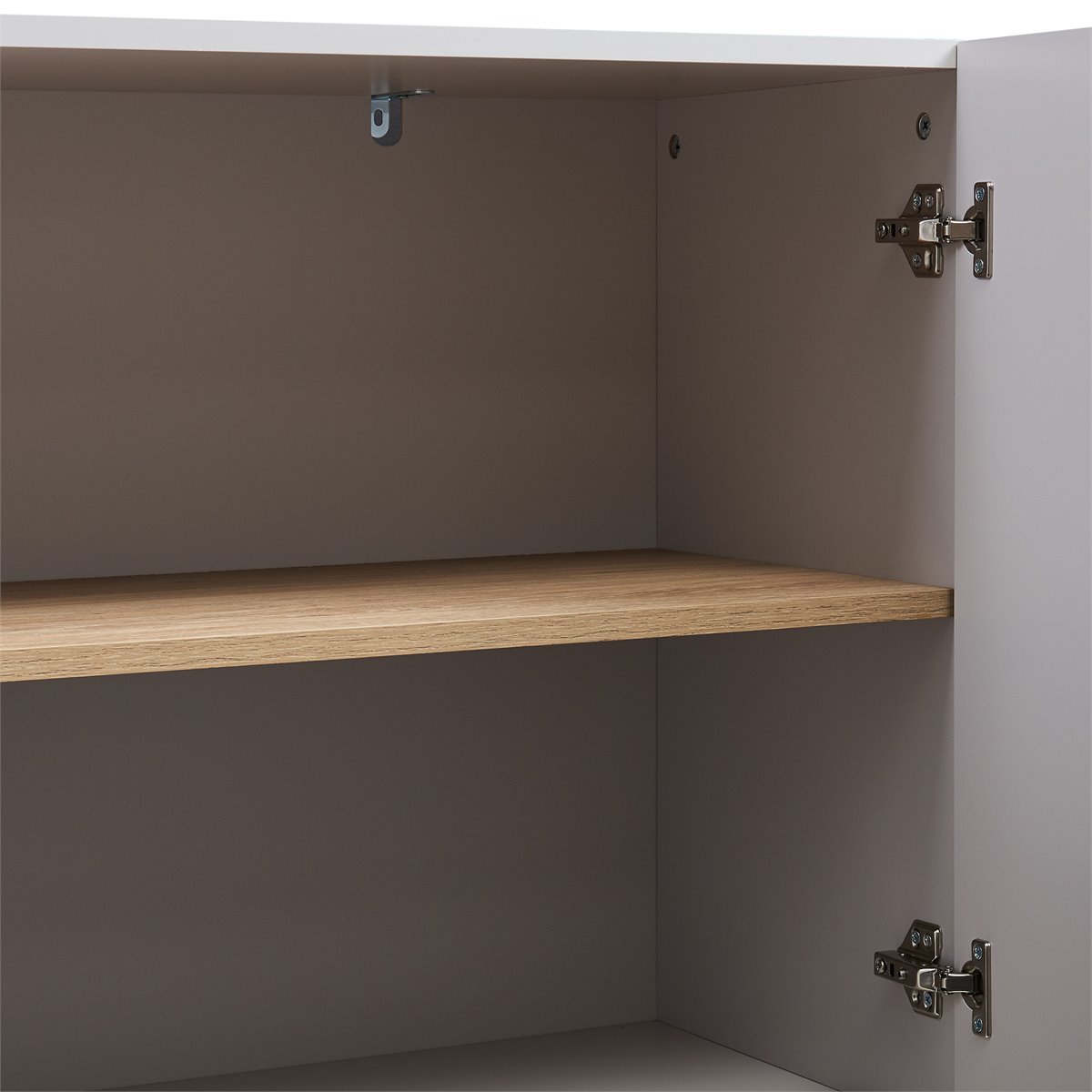 Las puertas cuentan con tiradores prácticos que facilitan la apertura. En la parte superior, puedes dejar volar tu creatividad: una planta, una vela aromática o un marco con tus fotos favoritas harán que el aparador cobre vida y refleje tu estilo personal. Su superficie de fácil cuidado te permite limpiarlo en un momento, solo con un paño húmedo.