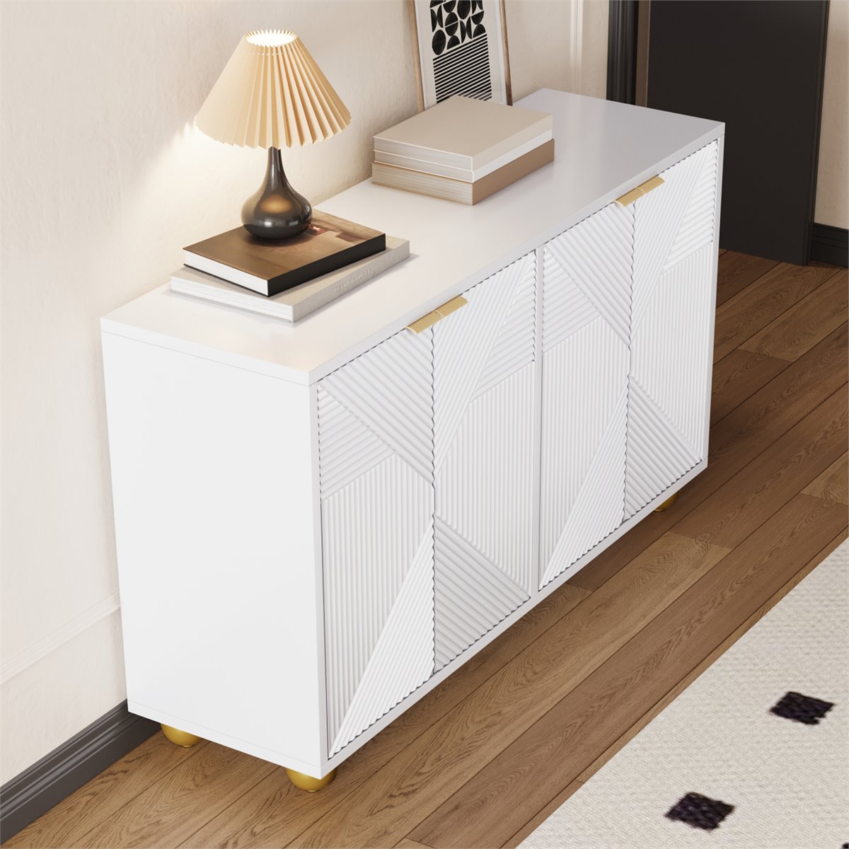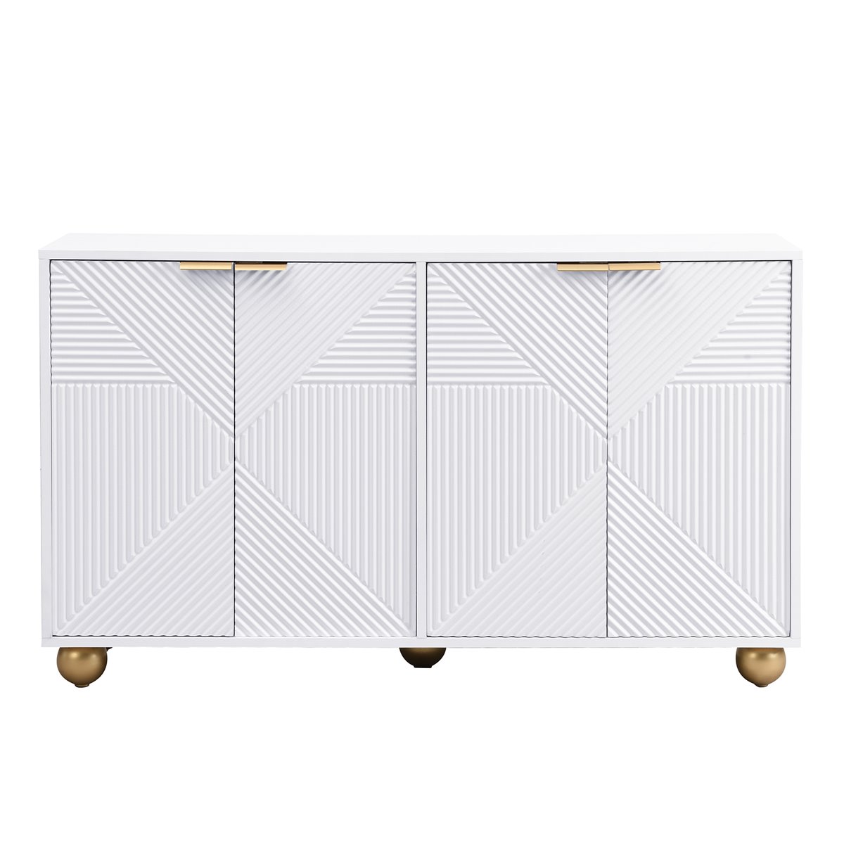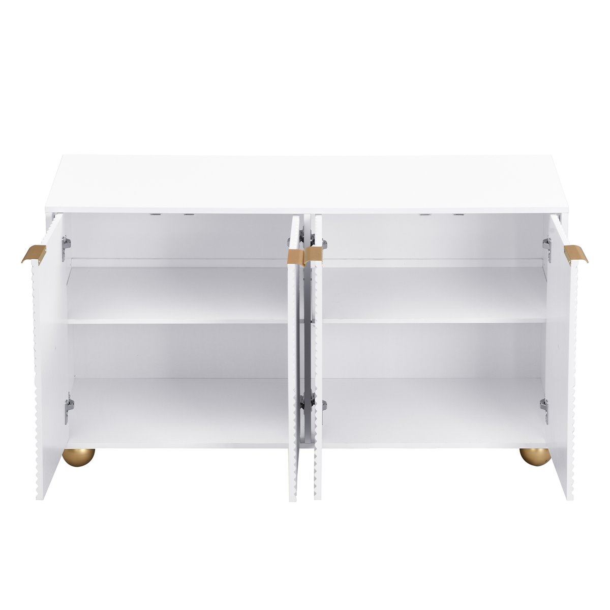 Este aparador cuenta con cuatro puertas con motivos tallados exquisitos. El producto presenta un encantador efecto de sombra y luz cuando se ilumina. El contraste sutil entre el pomo dorado y la esfera dorada resalta la elegante simplicidad de este producto y complementará una decoración moderna o minimalista.
