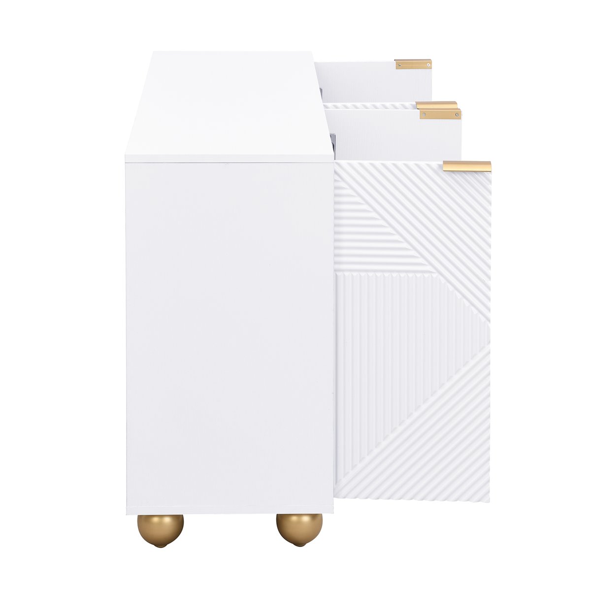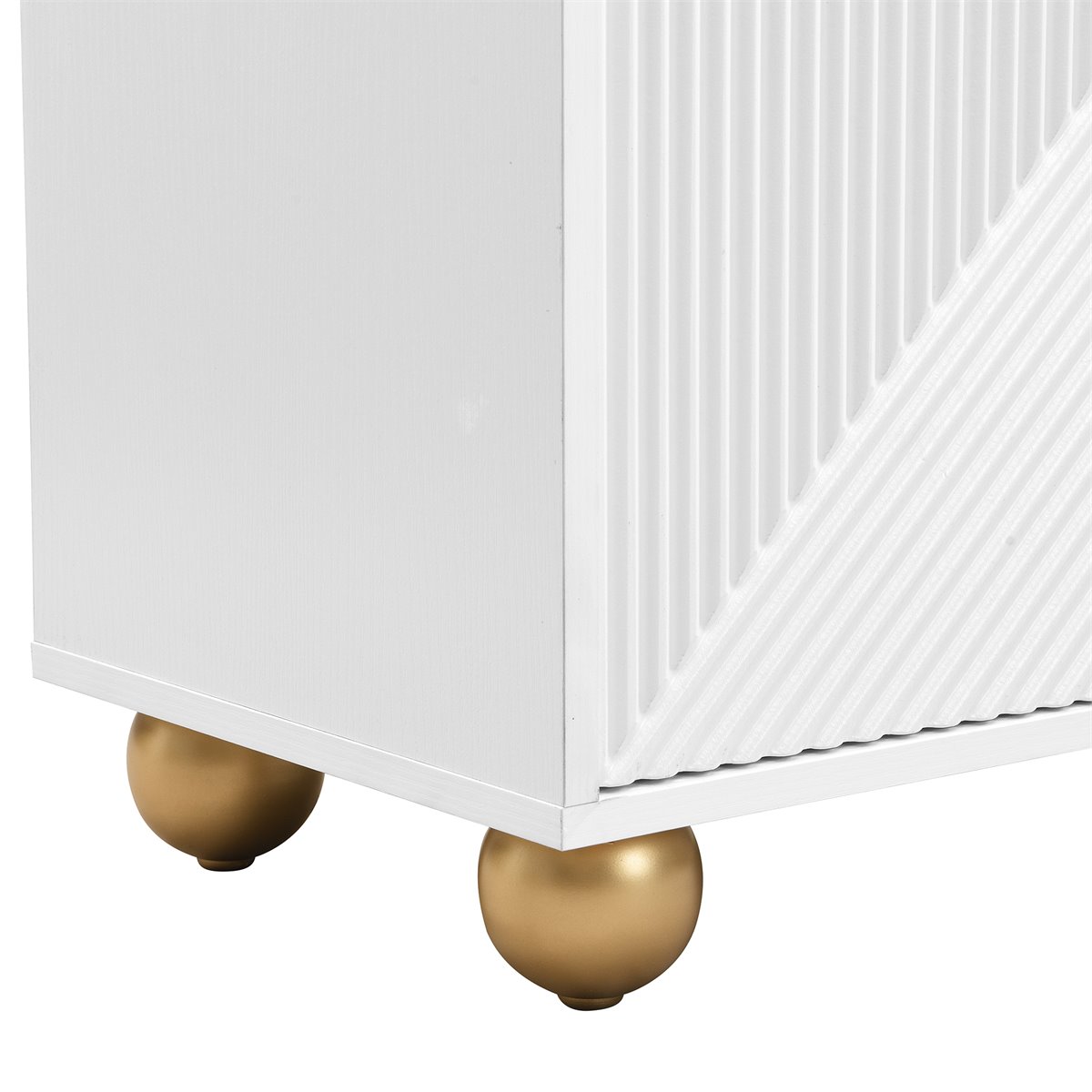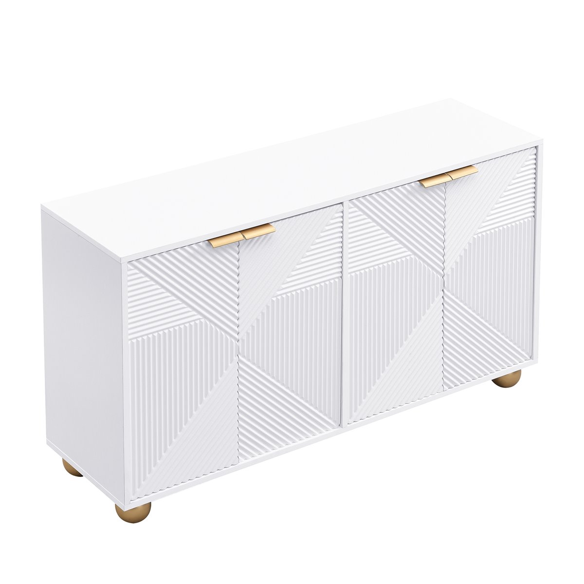 Este aparador cuenta con cuatro puertas con motivos tallados exquisitos. El producto presenta un encantador efecto de sombra y luz cuando se ilumina. El contraste sutil entre el pomo dorado y la esfera dorada resalta la elegante simplicidad de este producto y complementará una decoración moderna o minimalista.