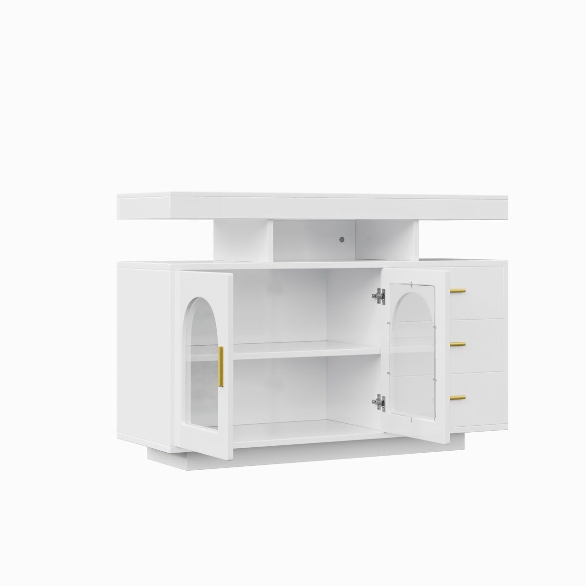 - Amplio espacio de almacenamiento: Incluye tres cajones, un armario y cuatro compartimentos abiertos, brindando un amplio espacio para organizar tus utensilios de cocina, decoraciones o incluso artículos de oficina.
