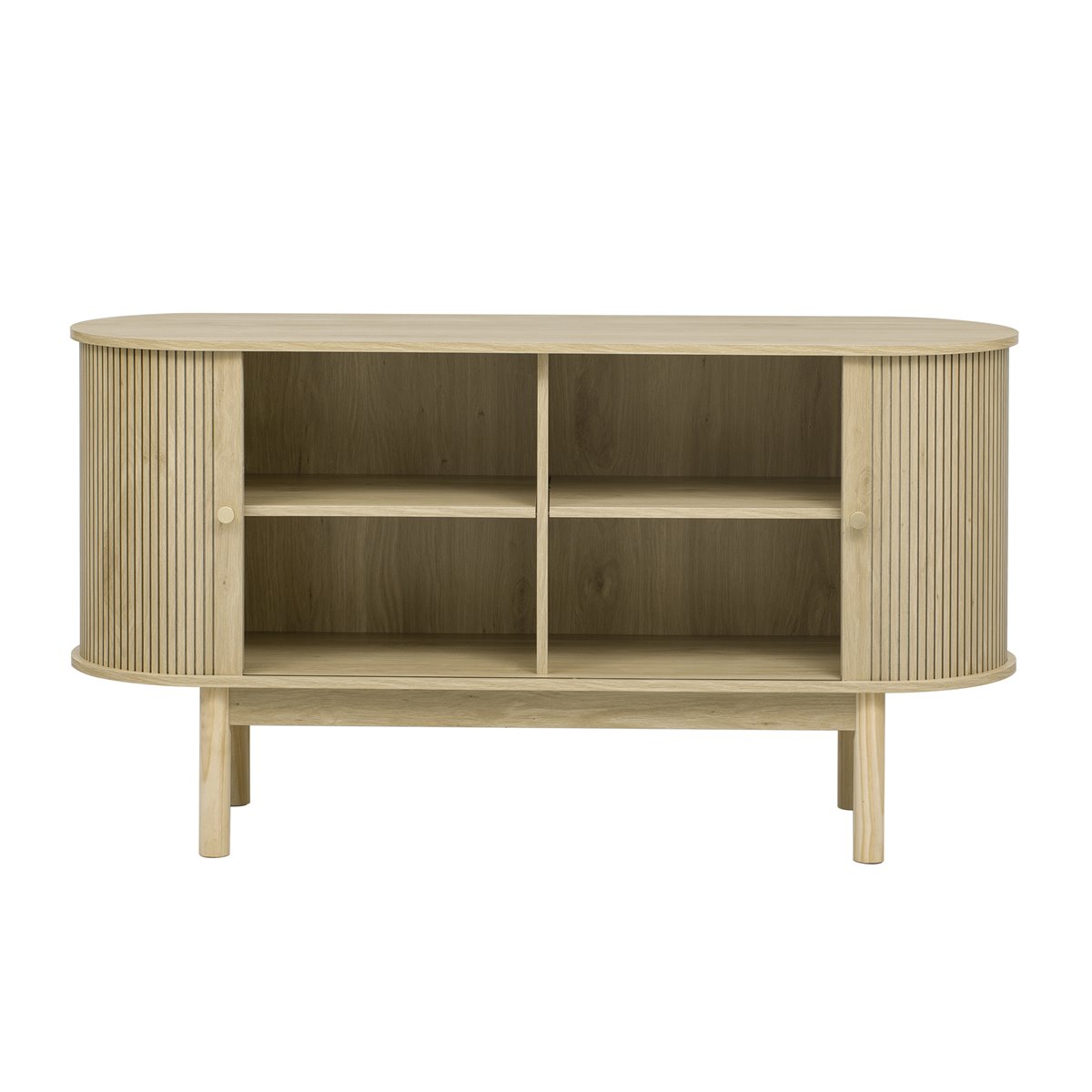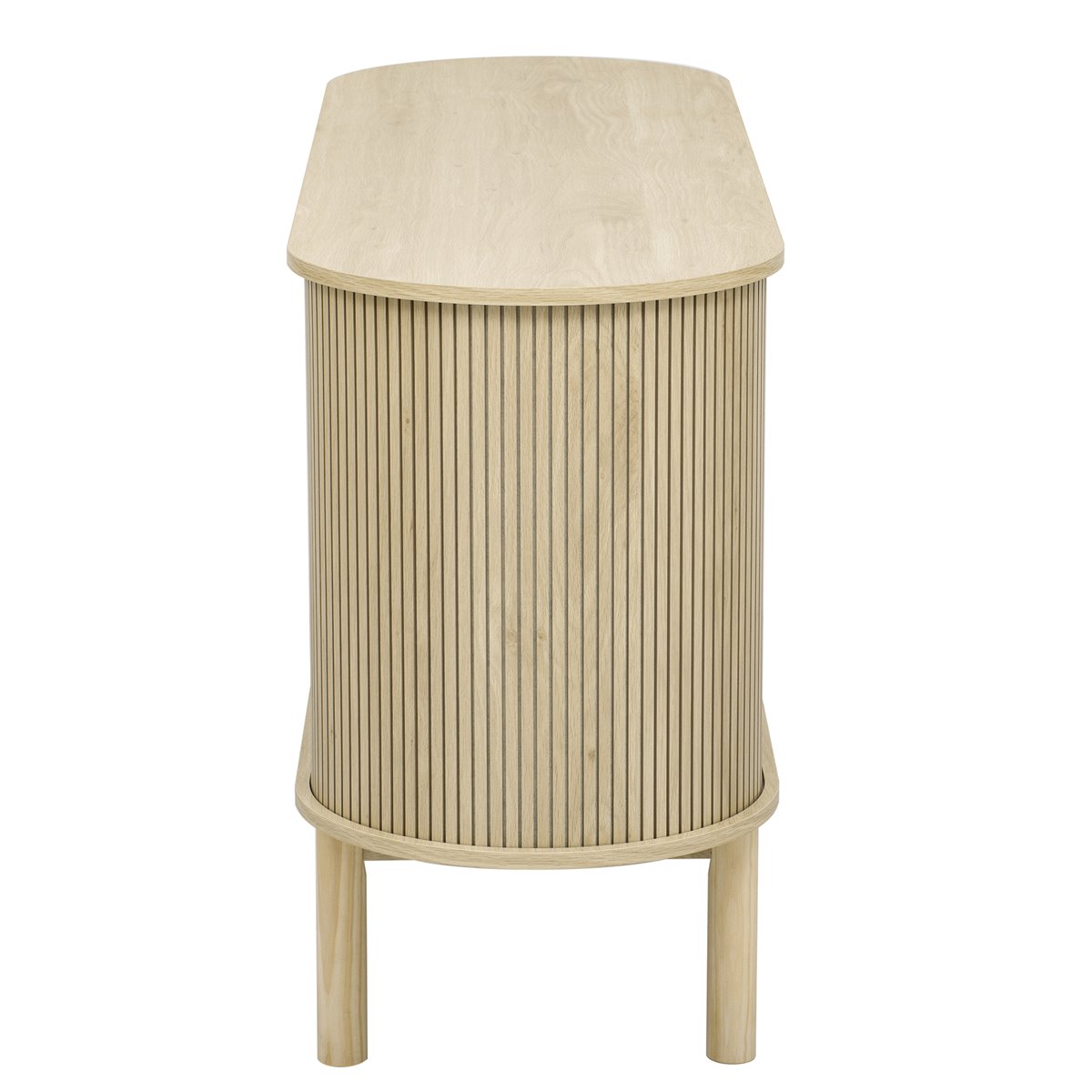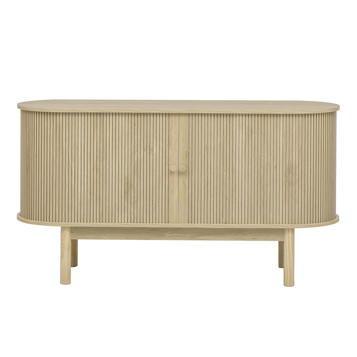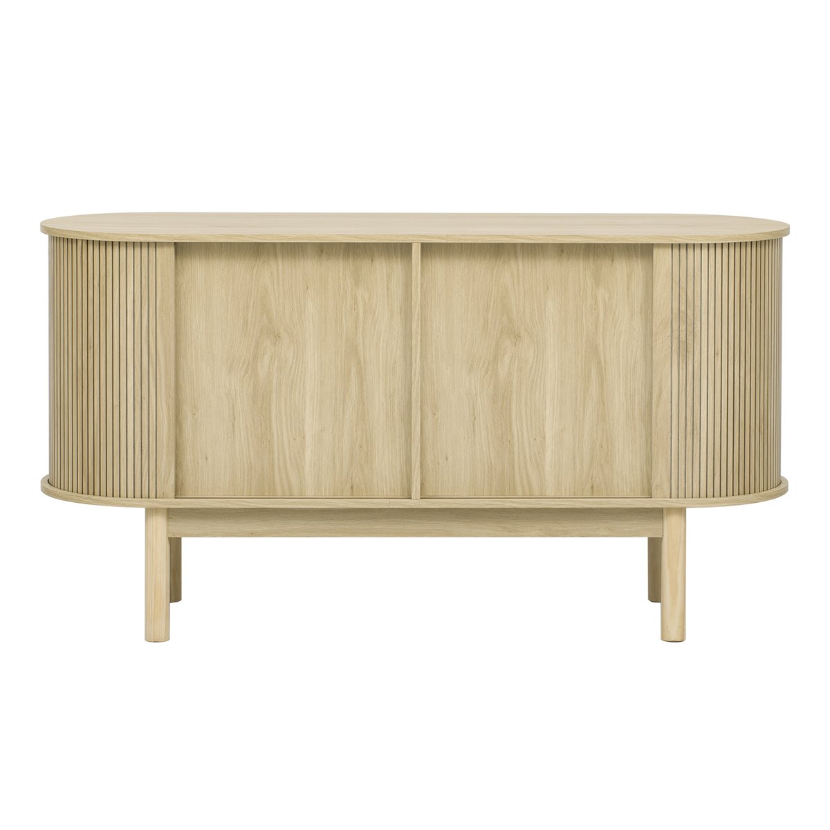 - Diseño elegante: Con su llamativo patrón de lamas y bordes redondeados, este aparador moderno atraerá todas las miradas. Su línea clara y detalles minimalistas se integran perfectamente en cualquier decoración moderna, aportando un toque elegante a cualquier habitación.