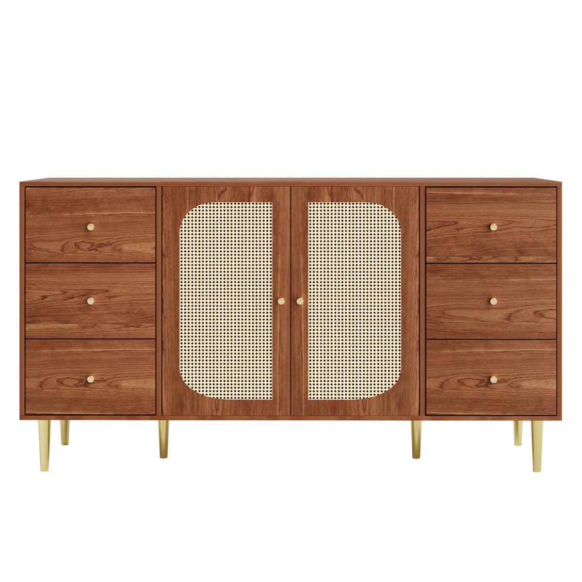 El diseño de este buffet es moderno y sencillo, con líneas suaves y tonos cálidos que crean una apariencia elegante. Los materiales originales en madera y la combinación de ratán y bambú hacen que el buffet tenga una elegancia moderna.