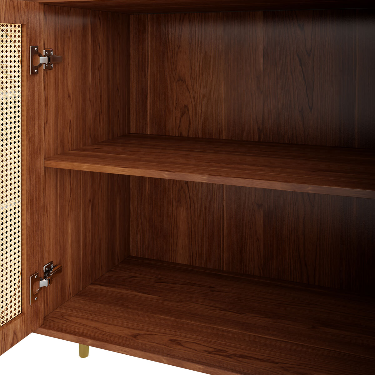 El diseño de este buffet es moderno y sencillo, con líneas suaves y tonos cálidos que crean una apariencia elegante. Los materiales originales en madera y la combinación de ratán y bambú hacen que el buffet tenga una elegancia moderna.