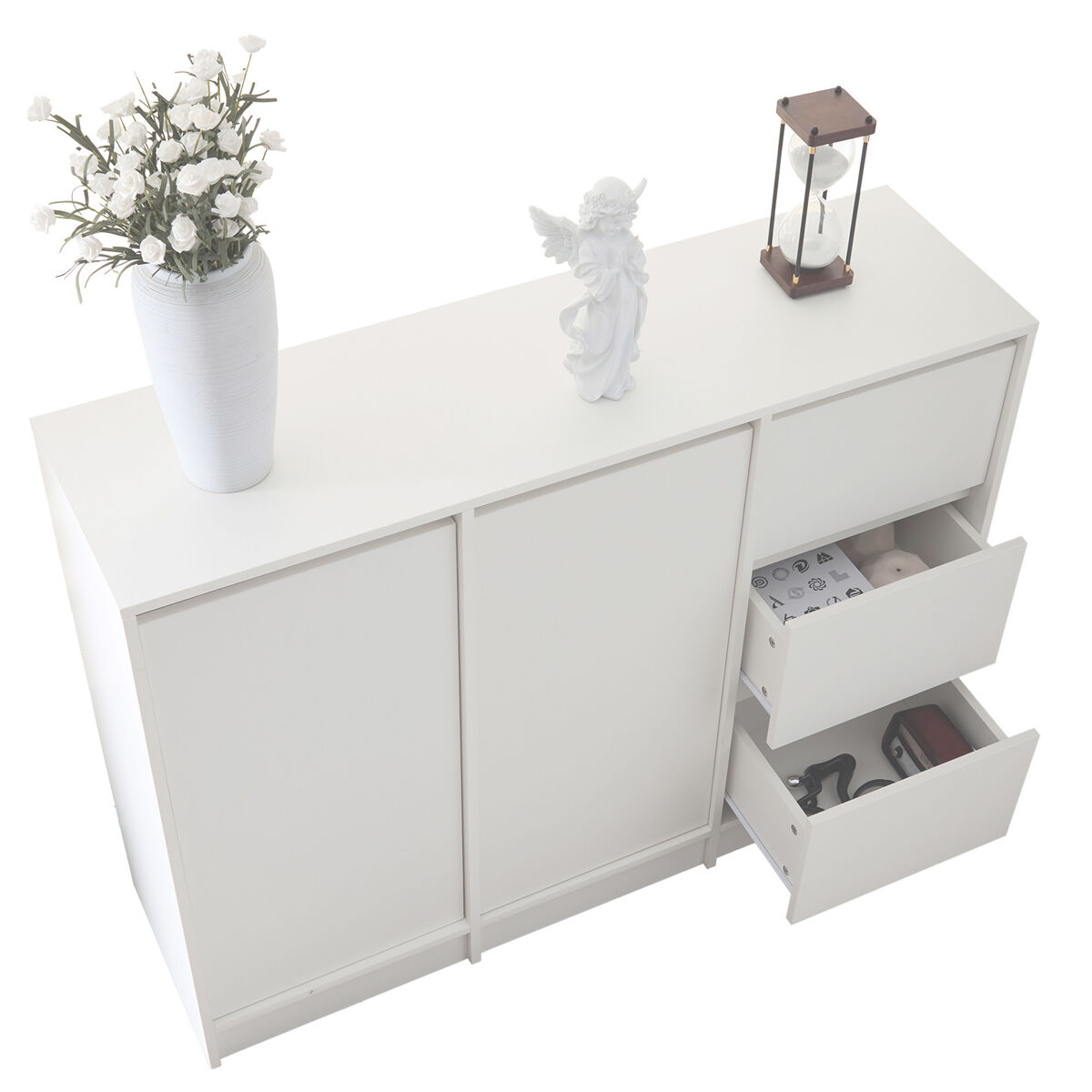 Este producto cuenta con una amplia superficie de trabajo de doble capa donde puede colocar fotos, jarrones o pequeñas decoraciones. Los cajones ofrecen mucho espacio. La zona inferior del armario también puede almacenar objetos adicionales para maximizar el espacio disponible.