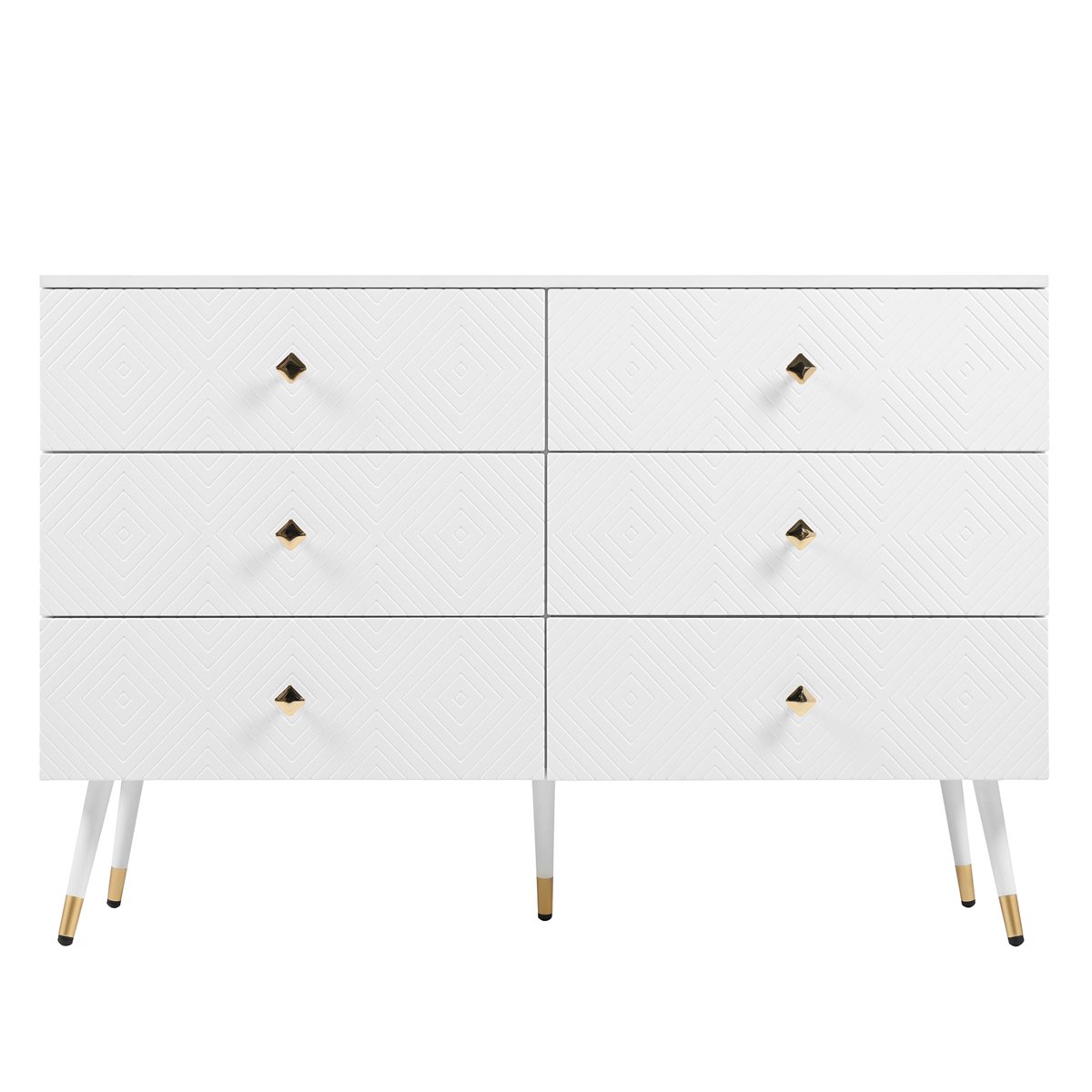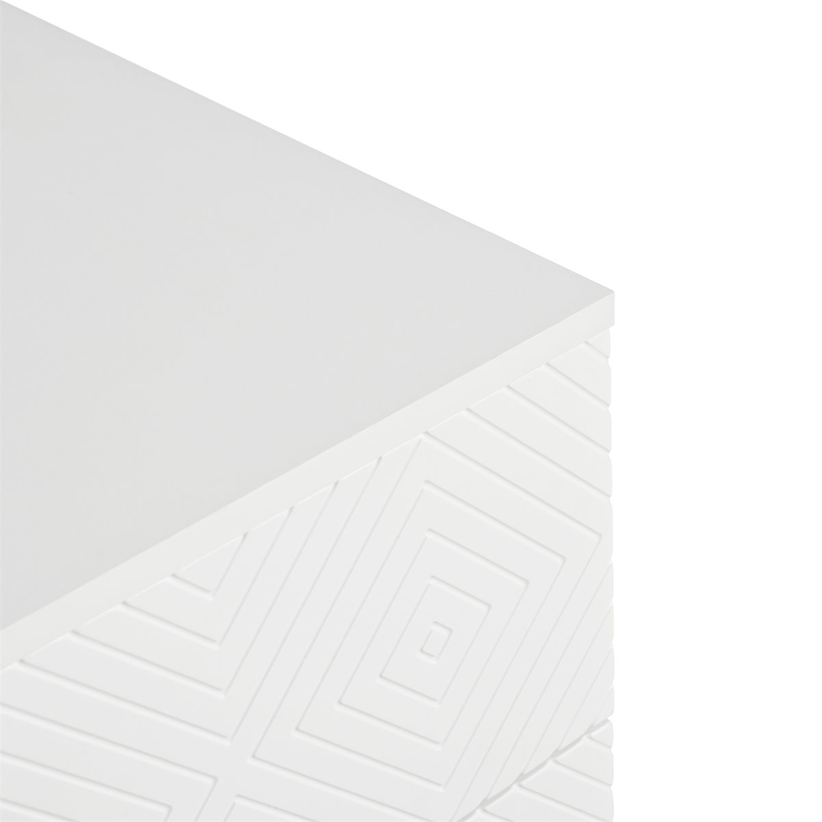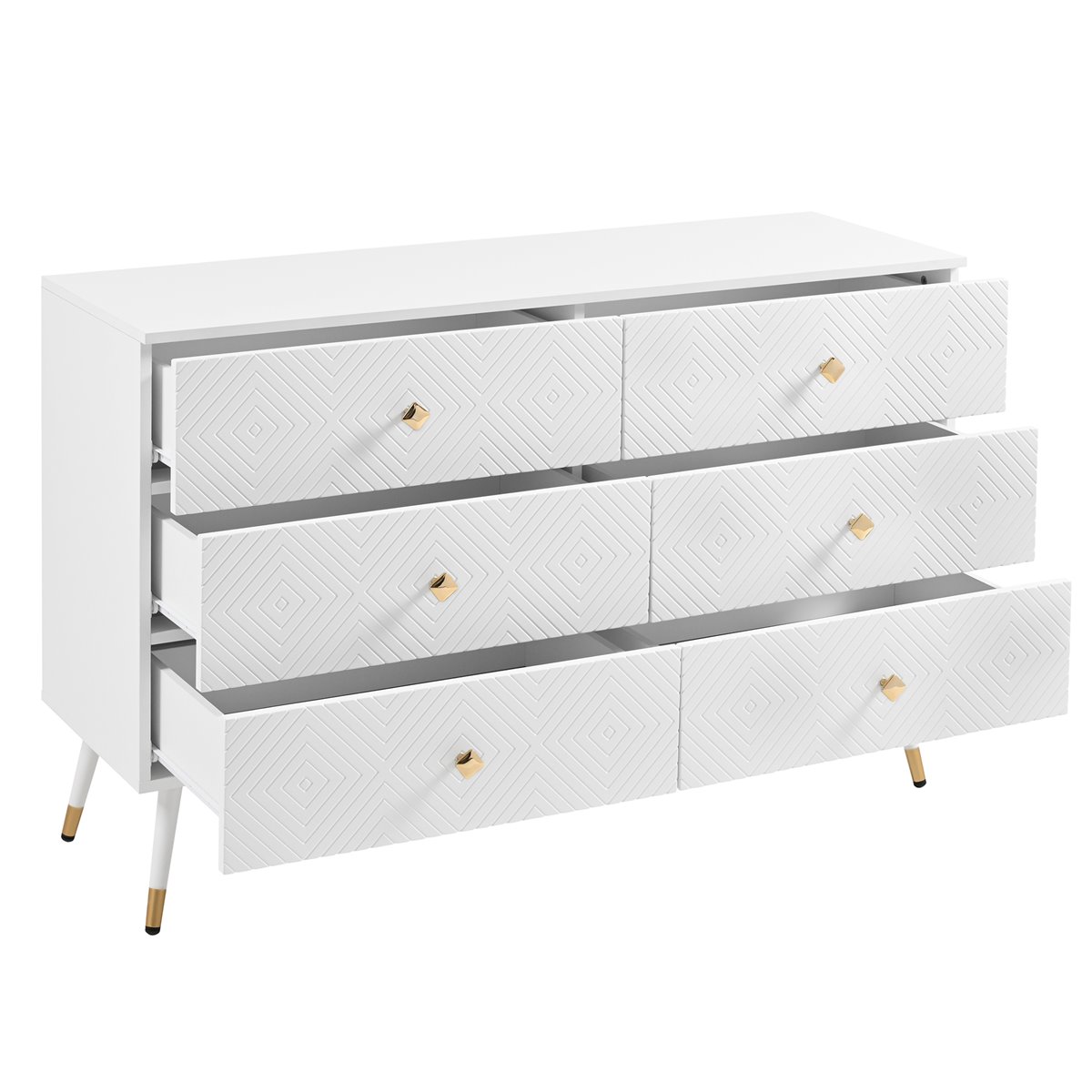 - Diseño Moderno: Elegante cómoda blanca con patrones geométricos y tiradores en forma de diamante, ideal para crear un ambiente sofisticado.