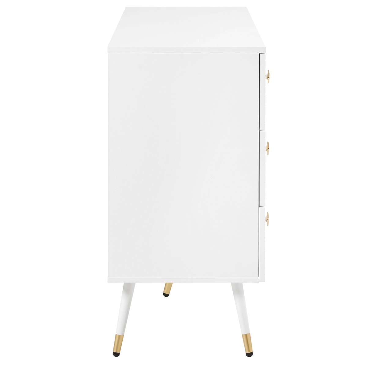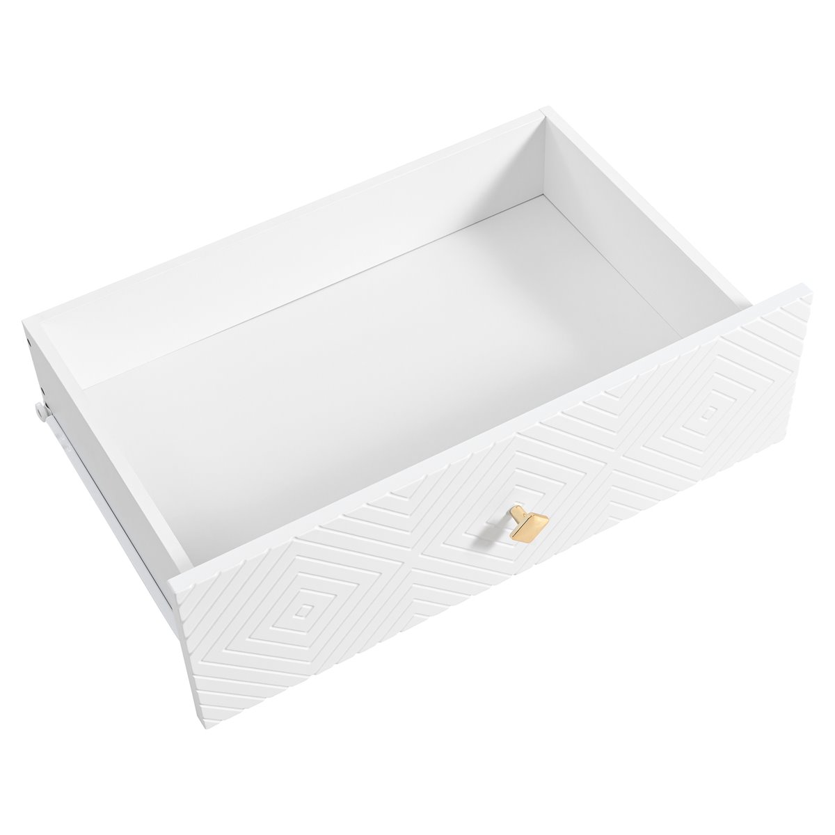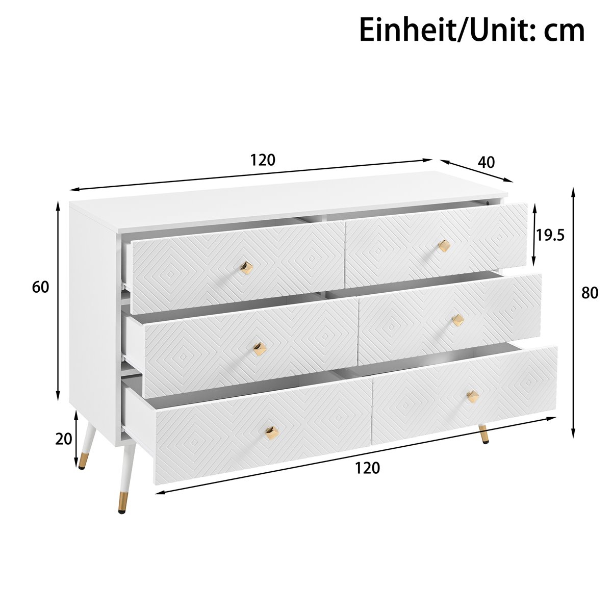 - Diseño Moderno: Elegante cómoda blanca con patrones geométricos y tiradores en forma de diamante, ideal para crear un ambiente sofisticado.