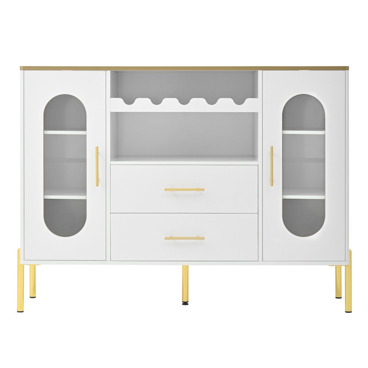 - Amplio almacenamiento: Cuenta con dos puertas de vidrio con estantes ajustables, dos cajones espaciosos y un práctico soporte para vinos, ofreciendo amplio espacio para almacenar vajilla, decoraciones y más.