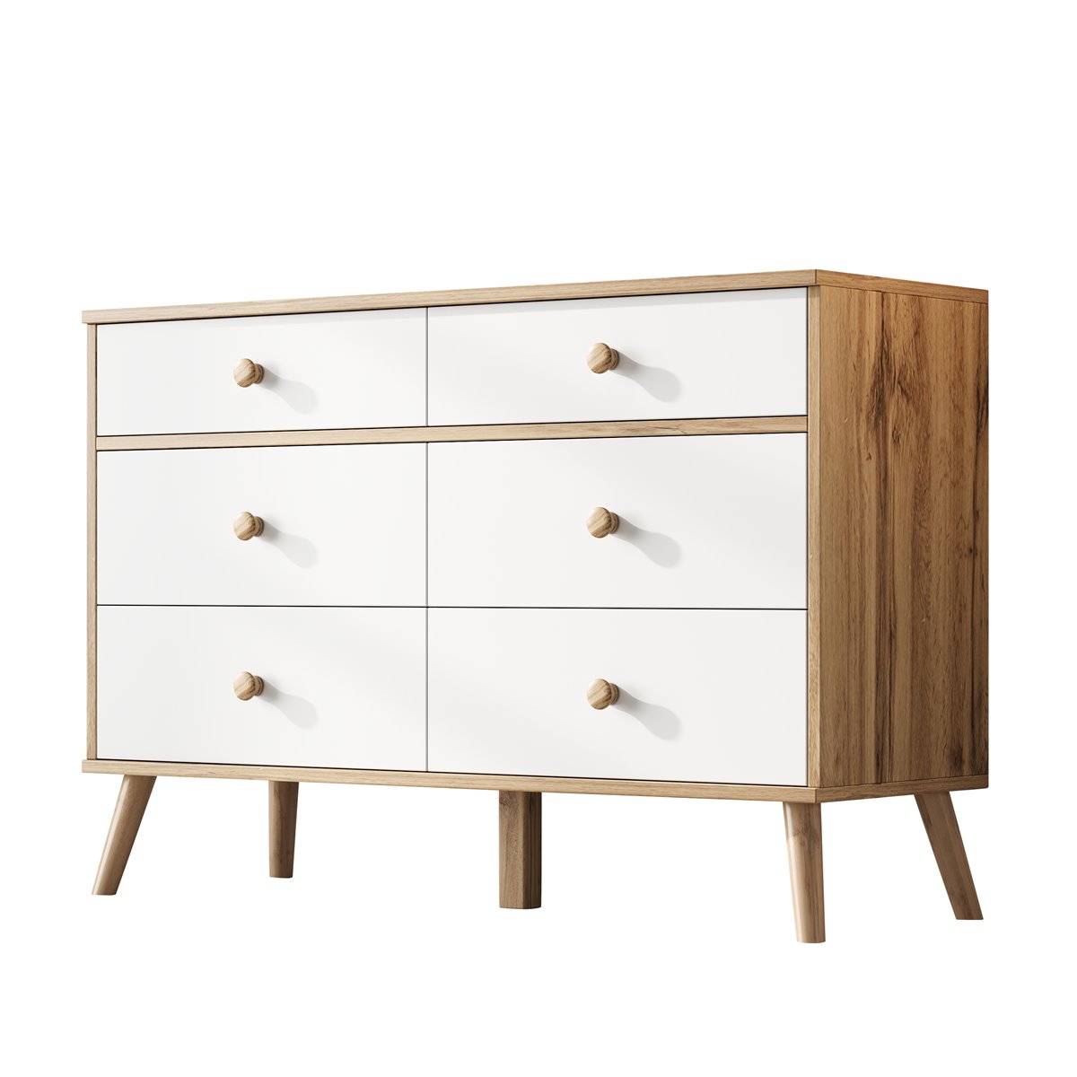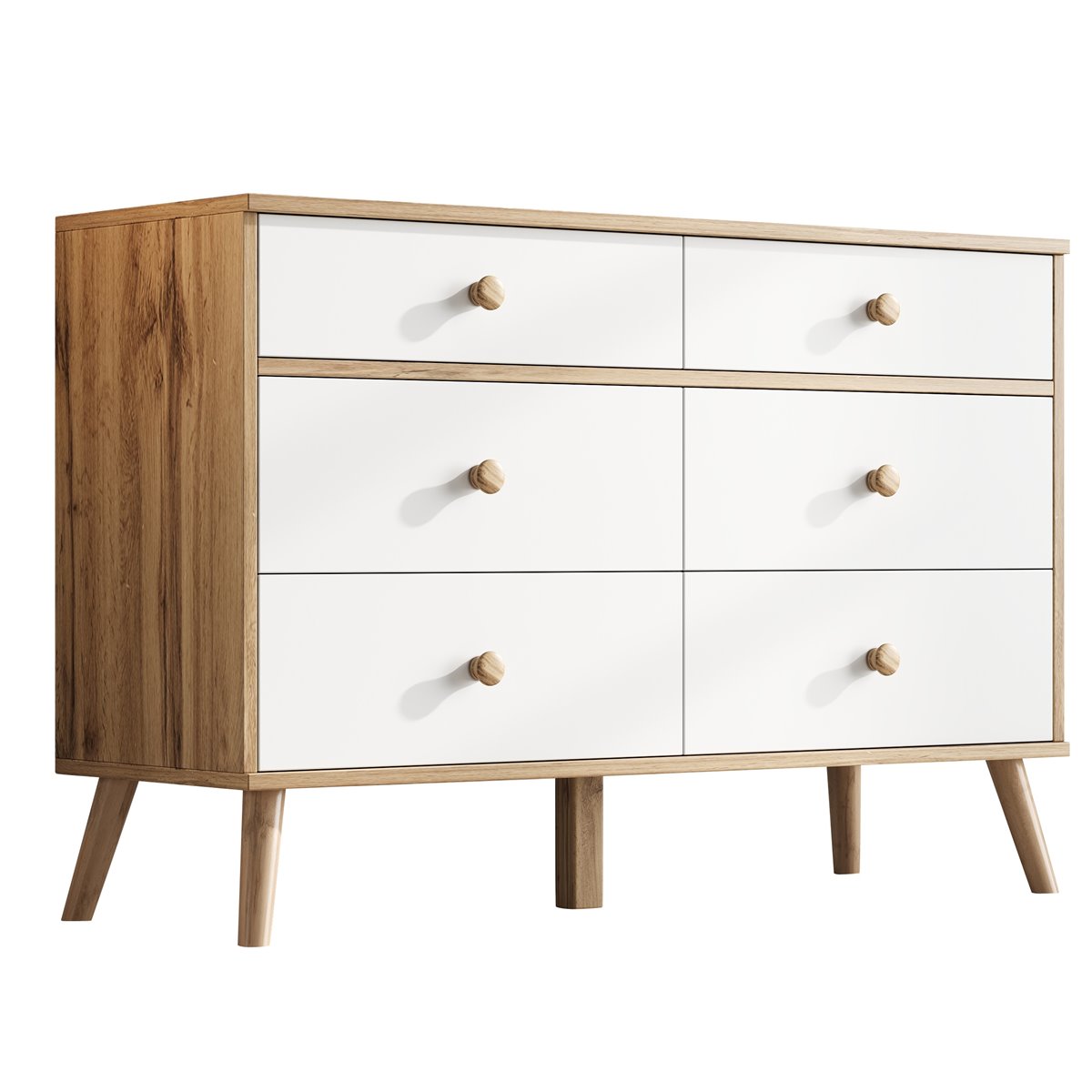- Estructura en madera natural con cajones blancos que aportan un contraste cálido y moderno, adecuado para estilos nórdico, japonés y contemporáneo.