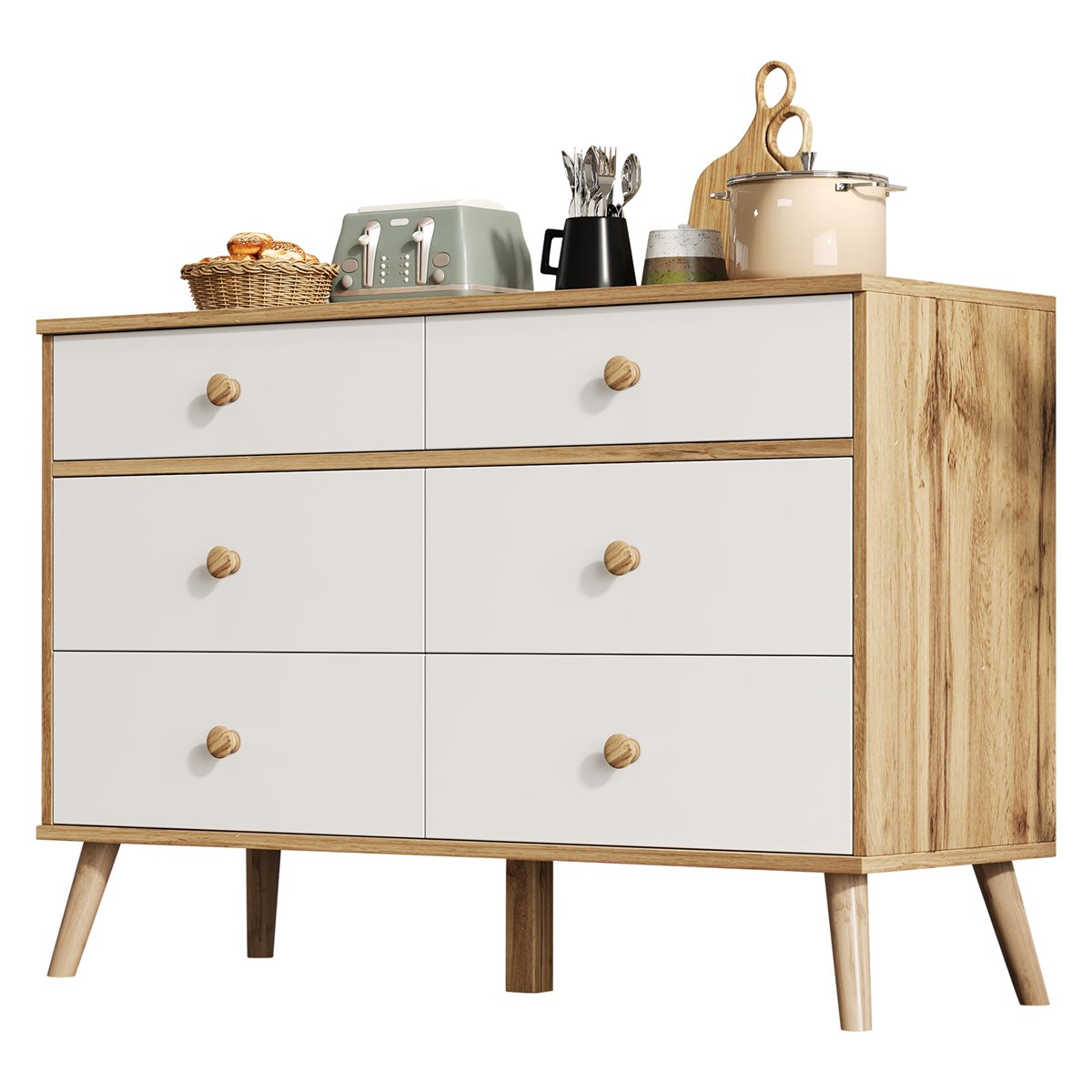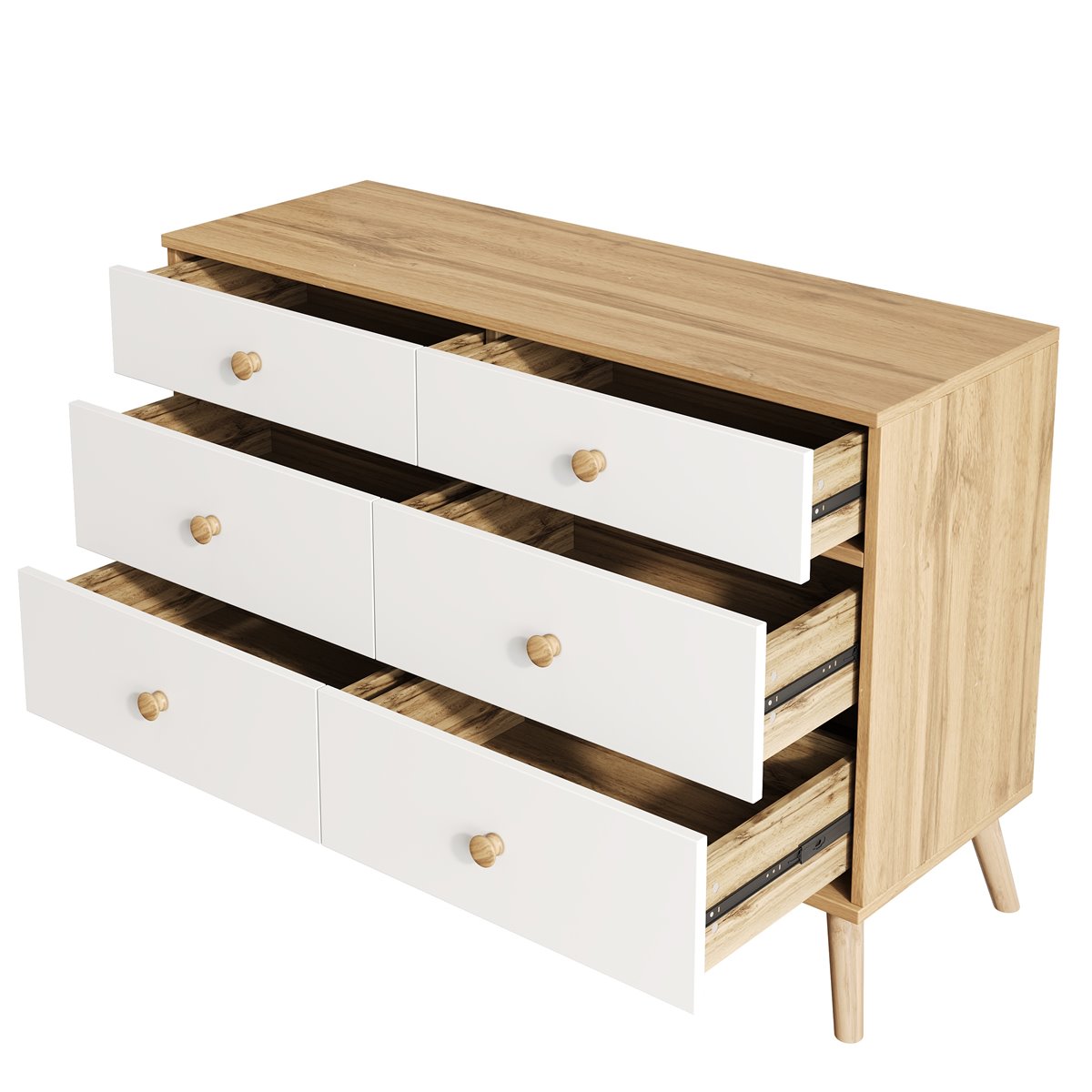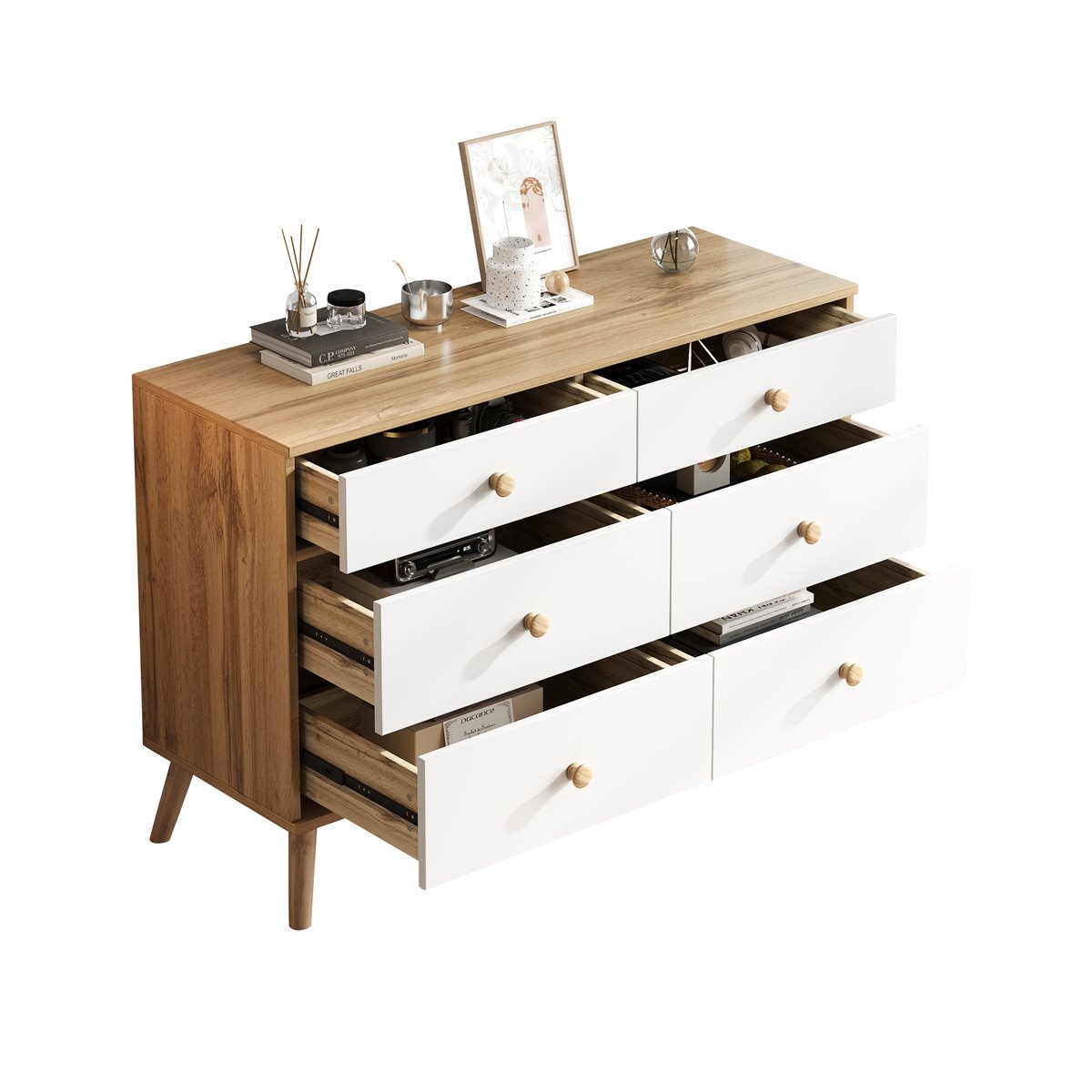 - Diseño funcional con 6 cajones, distribuidos en 3 niveles (15 cm y 20 cm de altura, 56 cm de ancho cada uno), para almacenar ropa, libros, documentos y objetos pequeños.