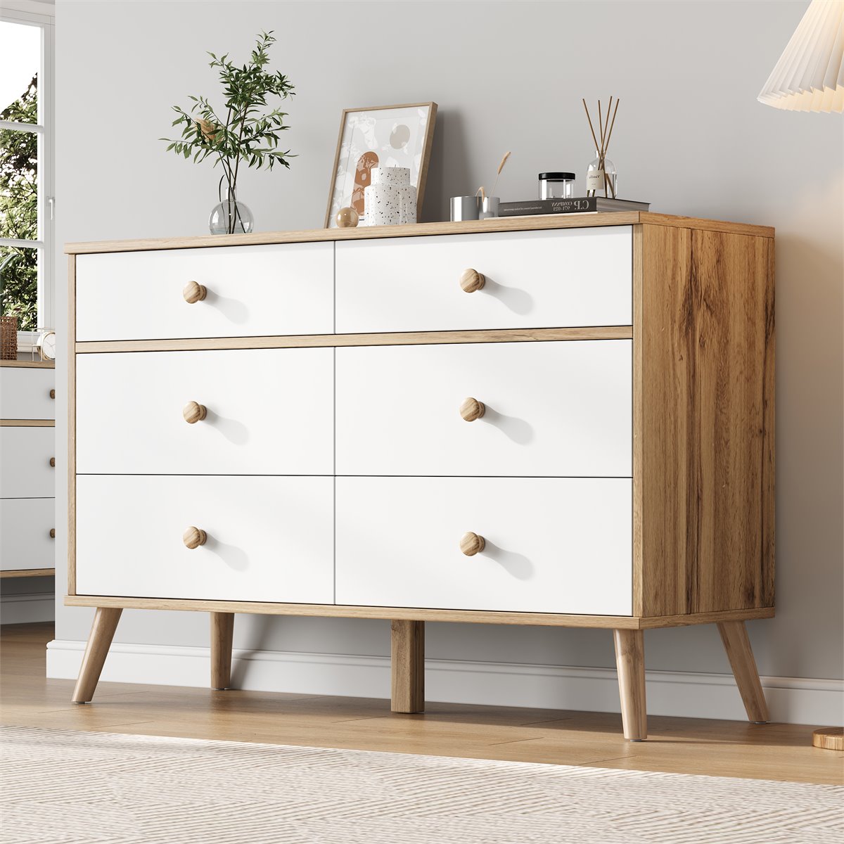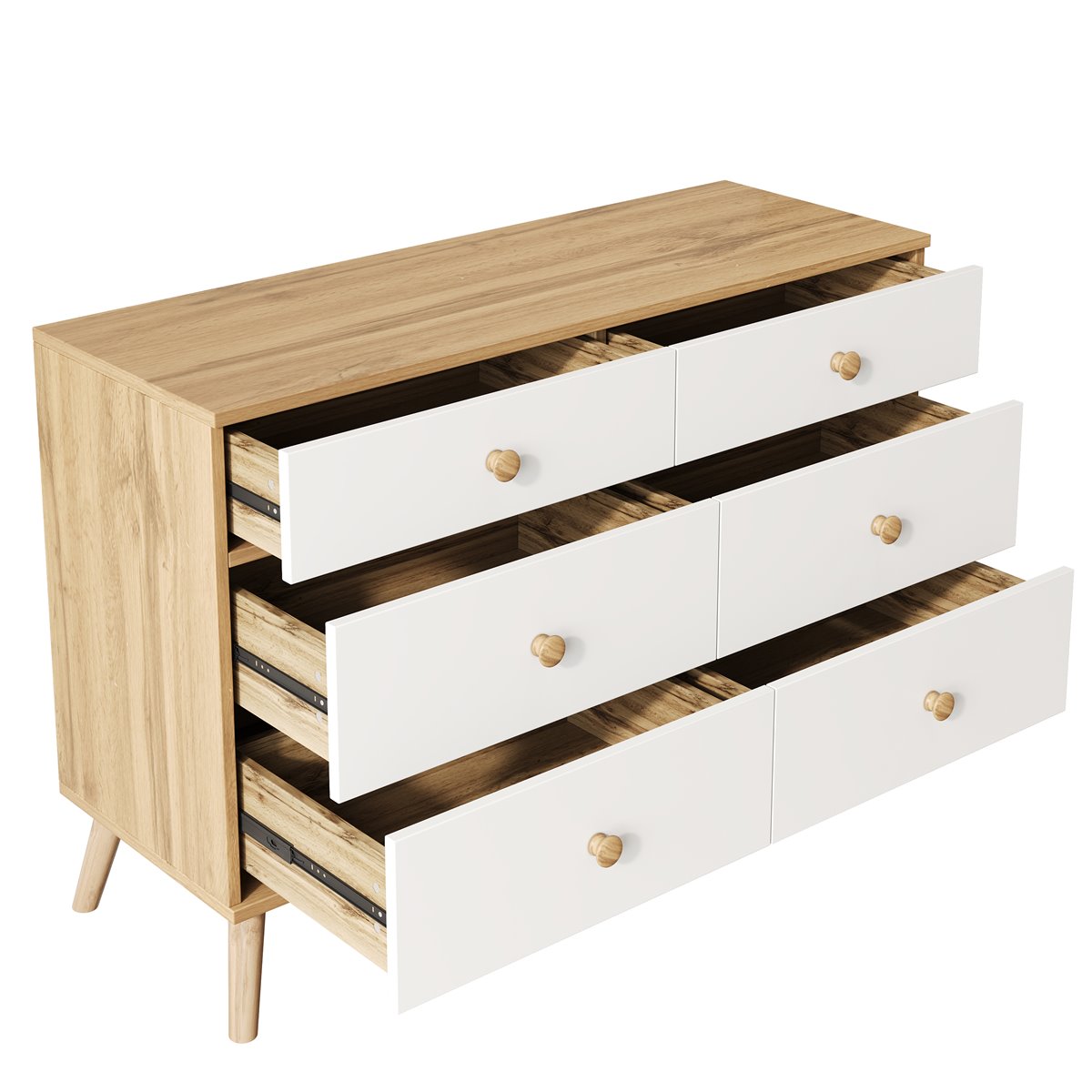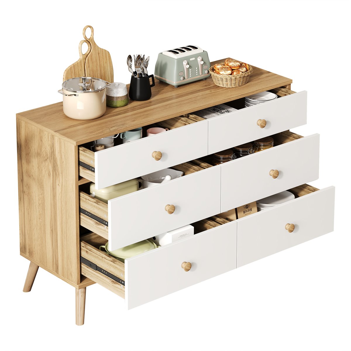 - Diseño funcional con 6 cajones, distribuidos en 3 niveles (15 cm y 20 cm de altura, 56 cm de ancho cada uno), para almacenar ropa, libros, documentos y objetos pequeños.
