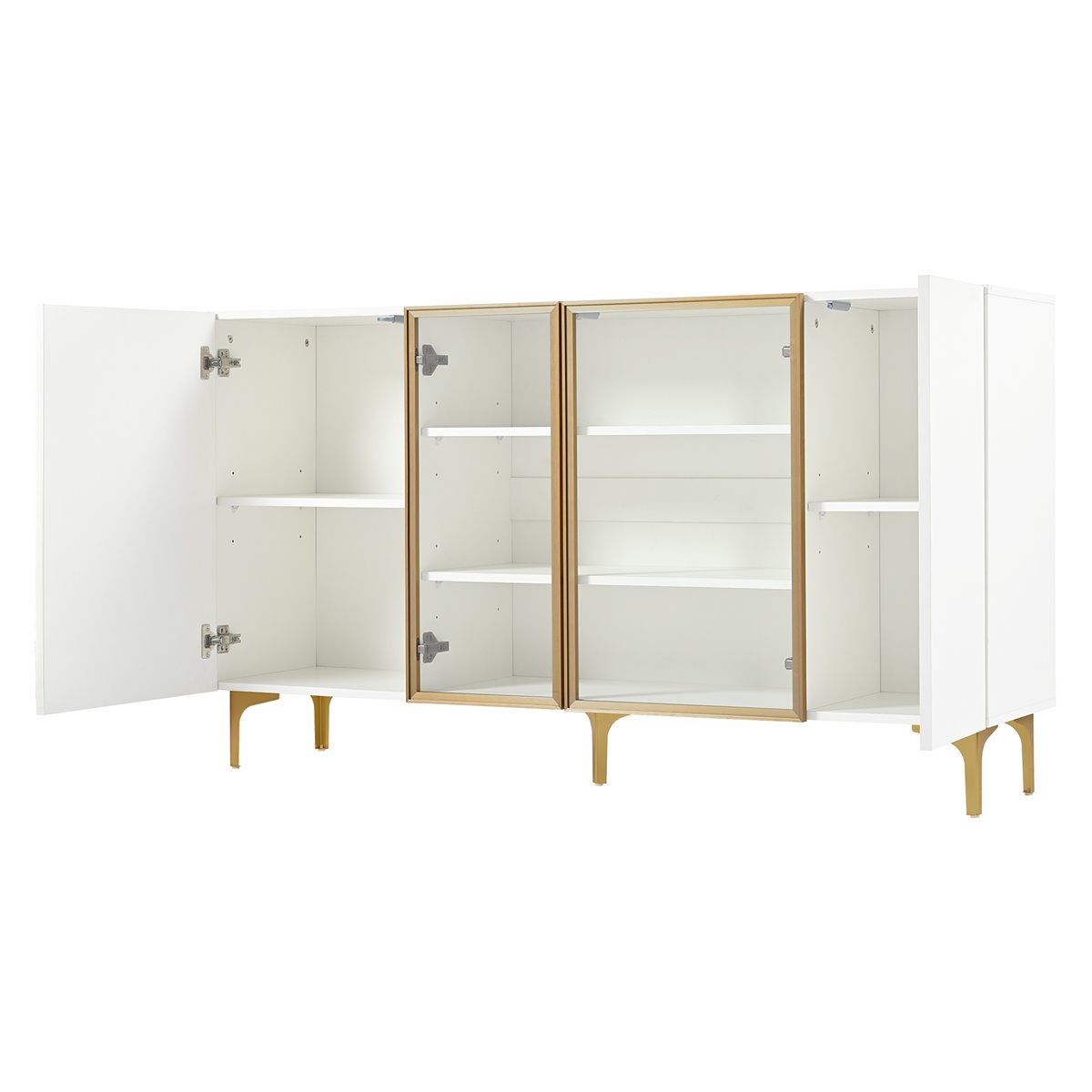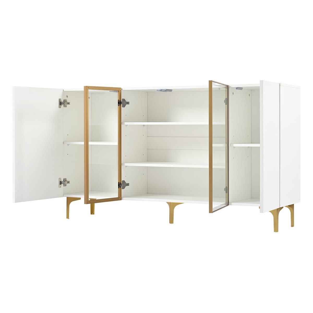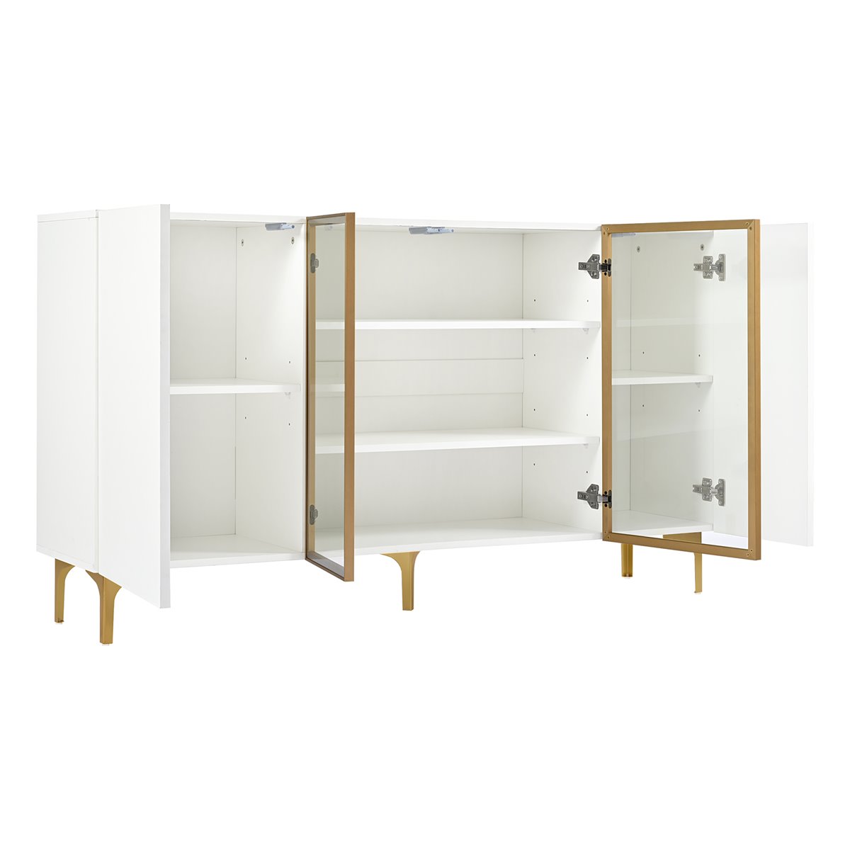 - Diseño moderno y elegante: Este aparador de 4 puertas en blanco con vidrio y metal combina funcionalidad y estilo, ideal para salones, comedores, pasillos o oficinas en casa.