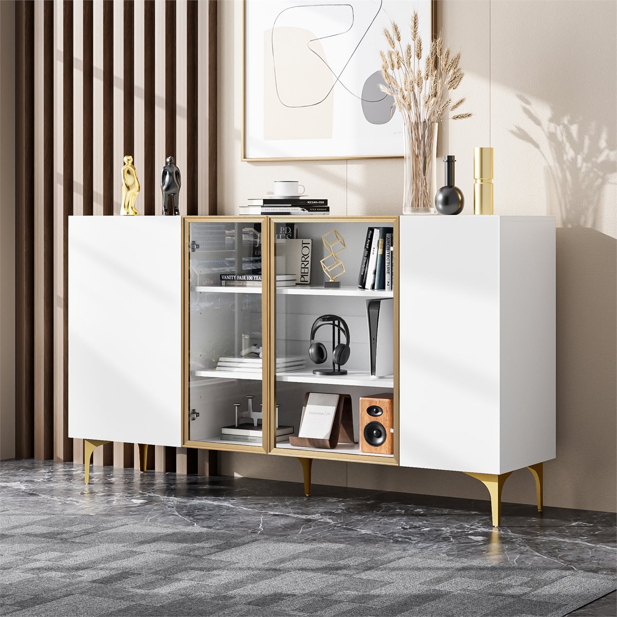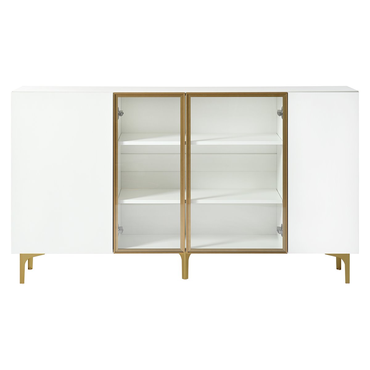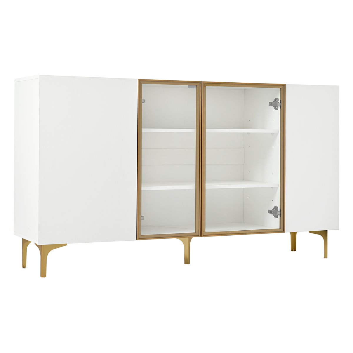 - Diseño moderno y elegante: Este aparador de 4 puertas en blanco con vidrio y metal combina funcionalidad y estilo, ideal para salones, comedores, pasillos o oficinas en casa.
