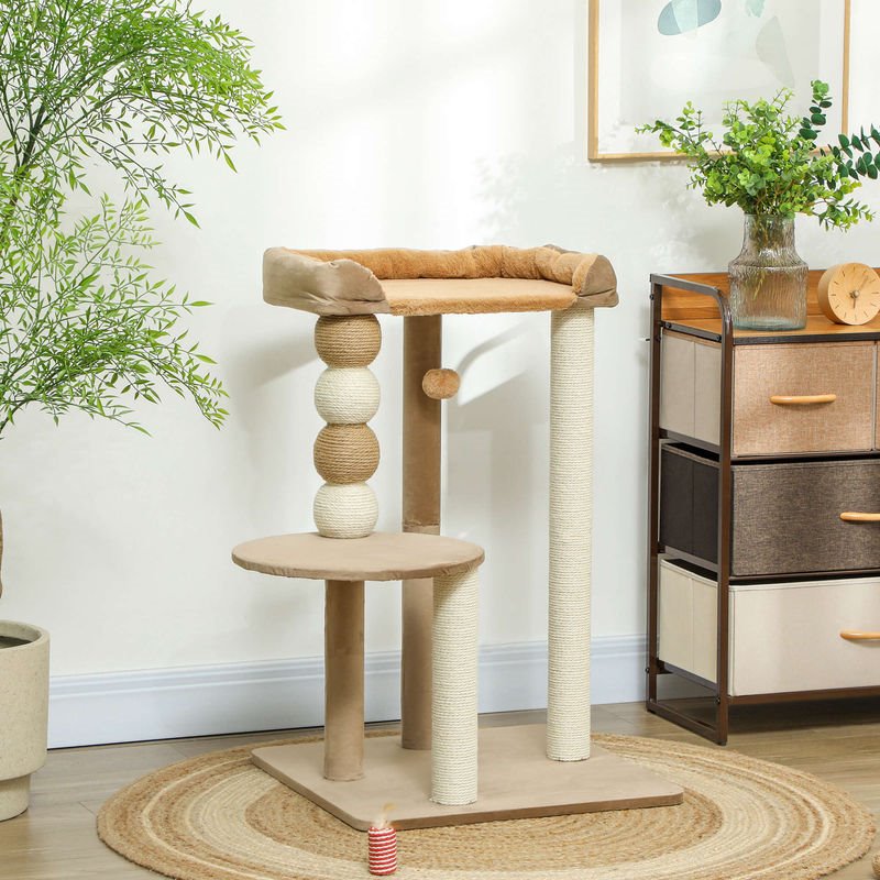 ¿Estás buscando un mini árbol para gatos? ¡Este de PawHut es ideal! En un espacio reducido contiene todo lo que tu gato necesita, postes de cuerda de yute para que pueda afilar sus garras, una plataforma y una cómoda cama en un tercer nivel que le permitirá trepar y descansar cómodamente o dormir.