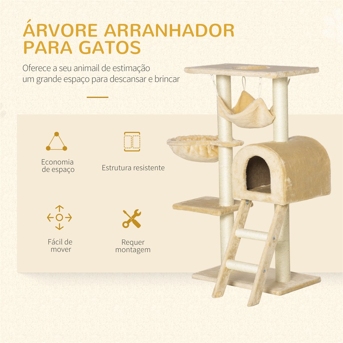 - Poste rascador para gatos equipado con 1 caseta, 2 plataformas, 1 cesta-nido, 1 hamaca y 1 escalera. Proporciona varias zonas de descanso y entrenamiento para tu gato