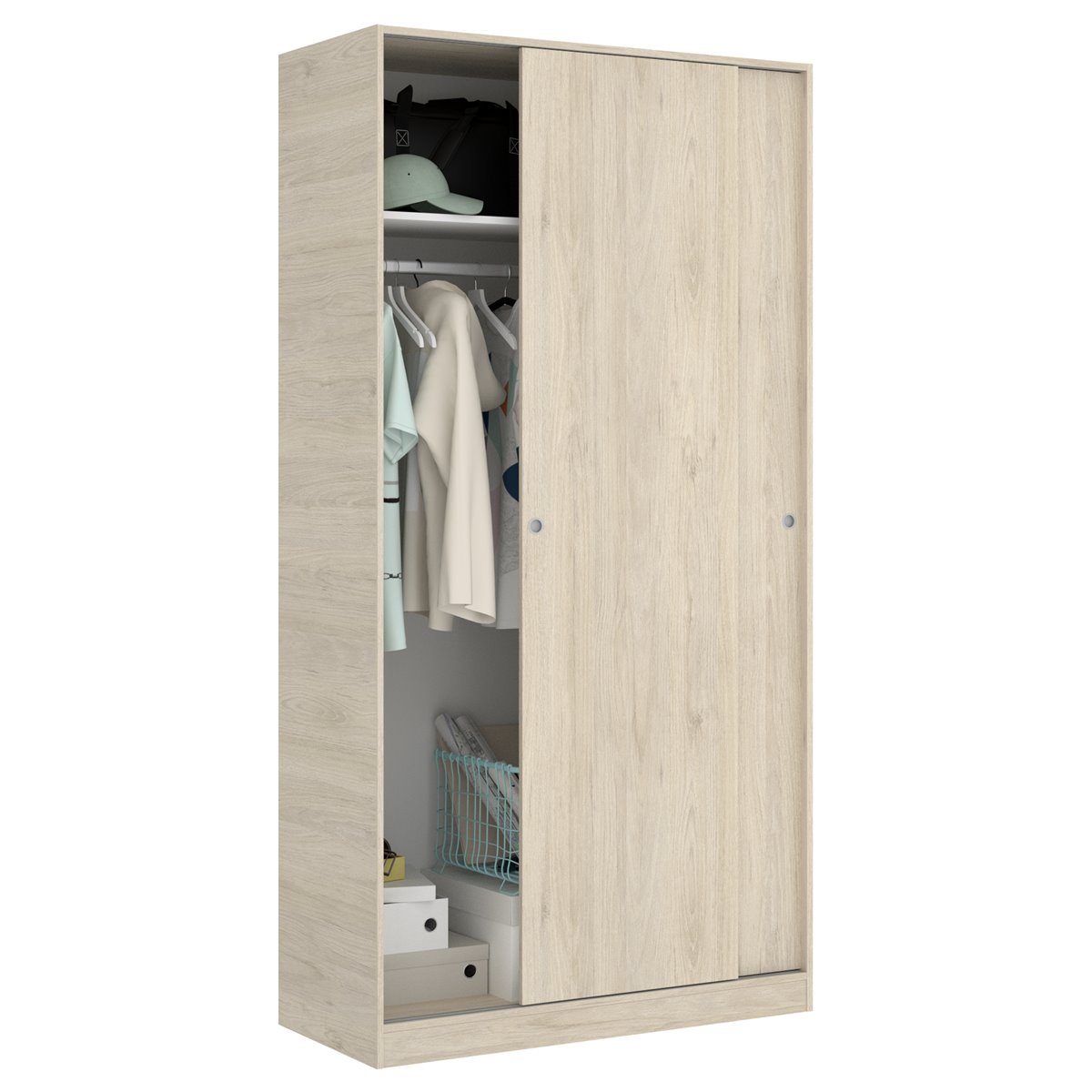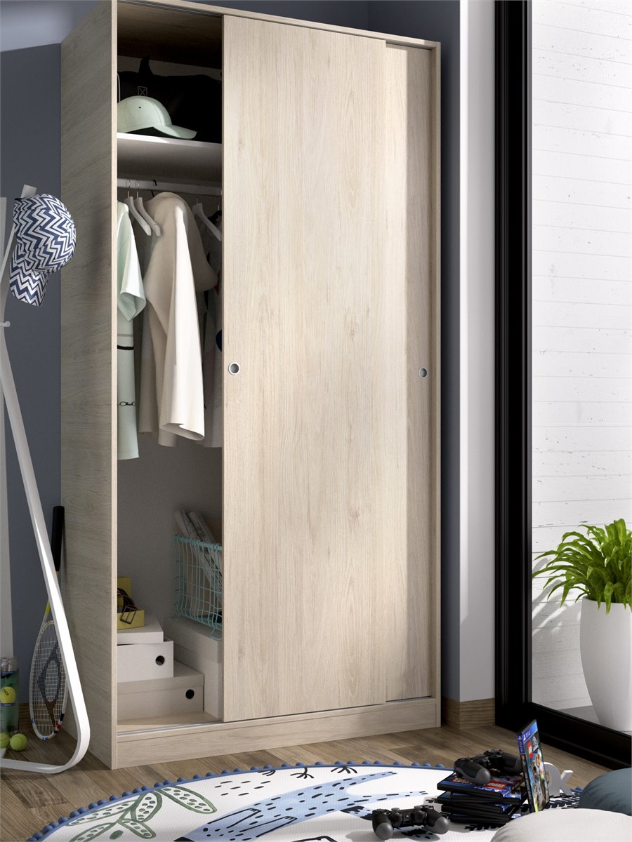 El armario con 2 puertas correderas modelo Slide Plus ha sido diseñado con materiales muy resistentes y un diseño minimalista, lo que le da un aspecto muy elegante y fácil de combinar con otros muebles de distintos estilos o con la decoración que tengas en el dormitorio. El armario cuenta con una organización interior que beneficia el inteligente aprovechamiento del espacio, con una zona para colgar prendas largas, un estante superior y una repisa inferior. Fabricado en melamina de alta calidad, de fácil montaje, diseño funcional y resistente al uso.