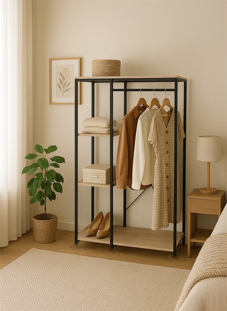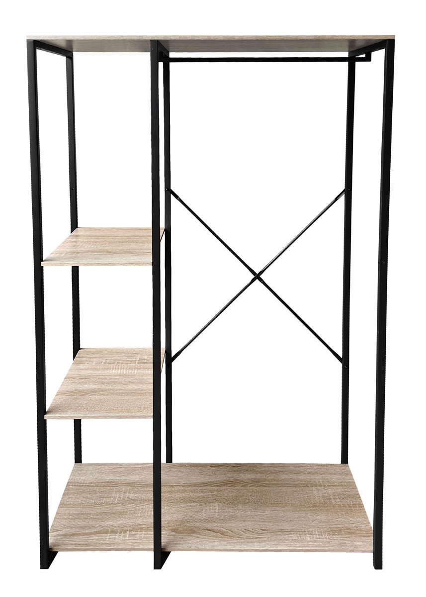 Este armario abierto combina funcionalidad y estética industrial con un diseño moderno y minimalista. Su estructura de acero en color negro ofrece resistencia y estabilidad, mientras que las baldas de melamina en acabado safir aportan un toque cálido y elegante al conjunto. A la derecha, una barra metálica permite colgar prendas largas o cortas con total comodidad. En el lado izquierdo, tres prácticas baldas proporcionan espacio adicional para organizar ropa doblada, calzado o cajas de almacenaje. Ideal para dormitorios, vestidores o espacios abiertos, este armario es la solución perfecta para quienes buscan una opción práctica sin renunciar al estilo urbano contemporáneo.