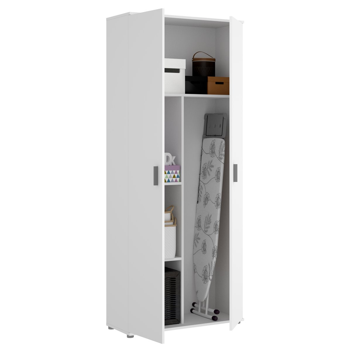 En el armario multiusos Fit podrás guardar toda clase de utensilios de limpieza. Cuenta con 3 estantes a la izquierda de tamaño medio; y un estante superior de generosas dimensiones. Dispone de un soporte adicional en el suelo de patas regulables en altura y anti humedad. Color: Blanco Mate. Dimensiones:Alto: 190 cm x Ancho: 78 cm x Fondo: 35 cm. Regulador de altura y anti humedad. Armario auxiliar multiusos, ideal para almacenar productos de limpieza o como despensa. Requiere montaje. Bisagras metálicas. Incluye todos los herrajes, piezas e instrucciones para su perfecto montaje. Servicio Post venta.
