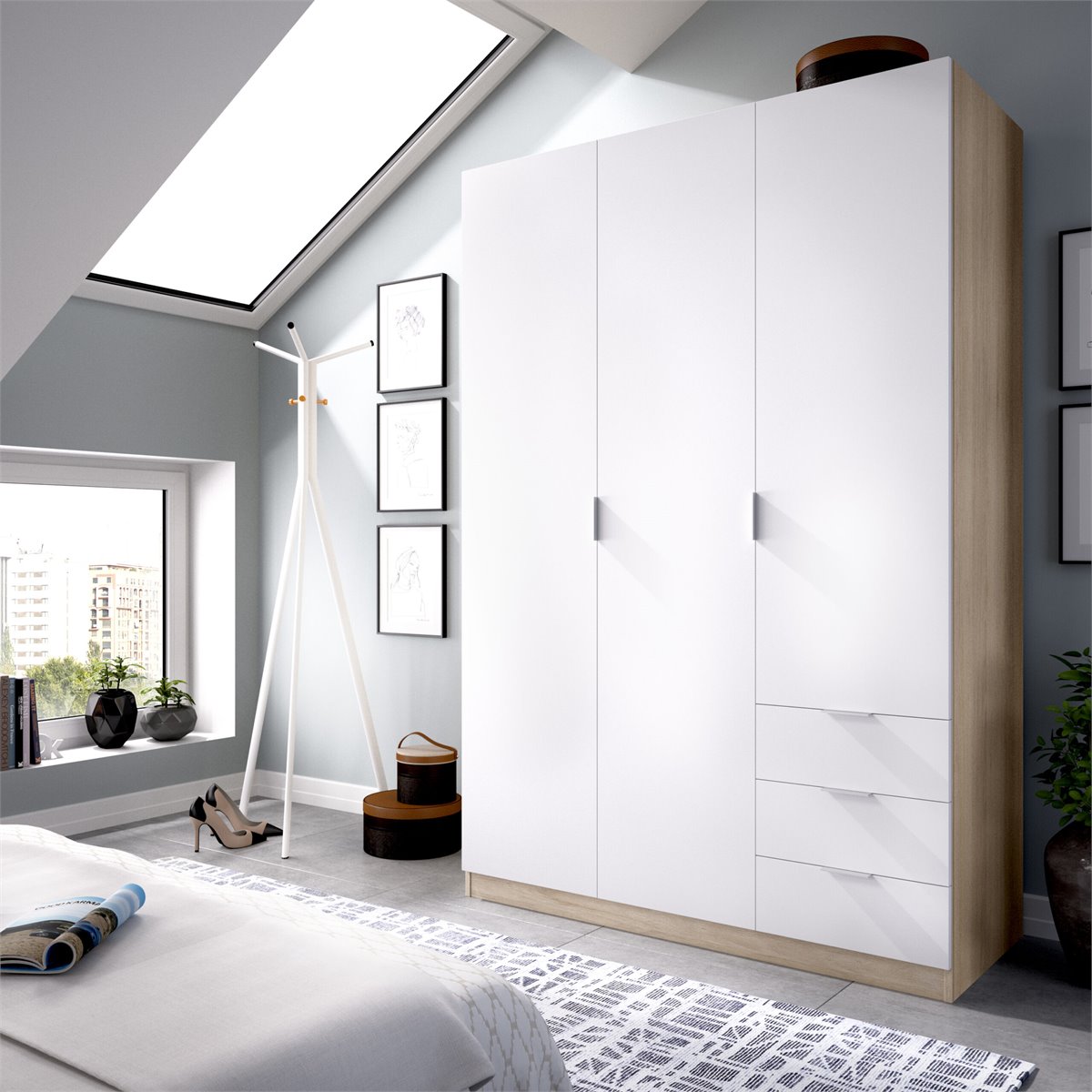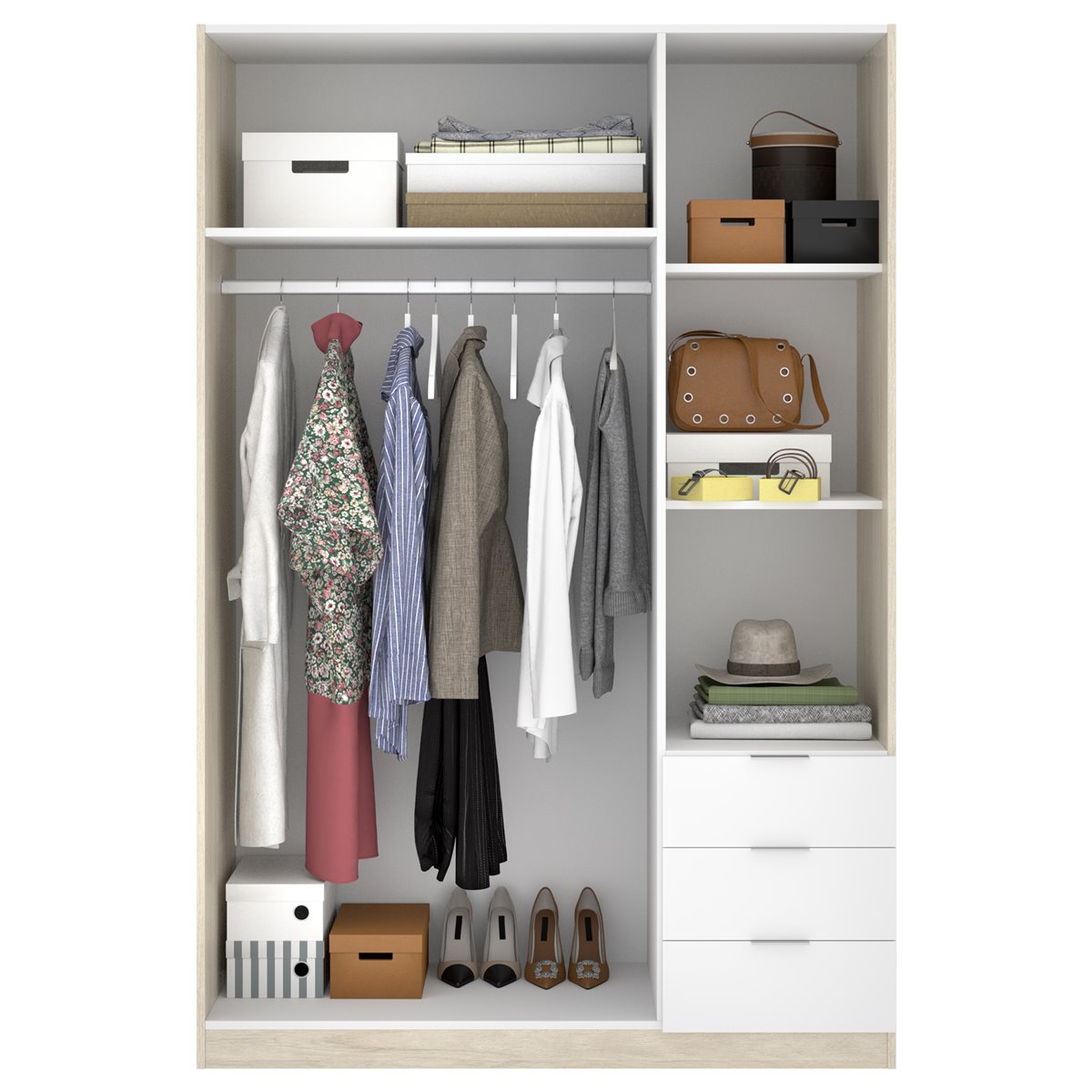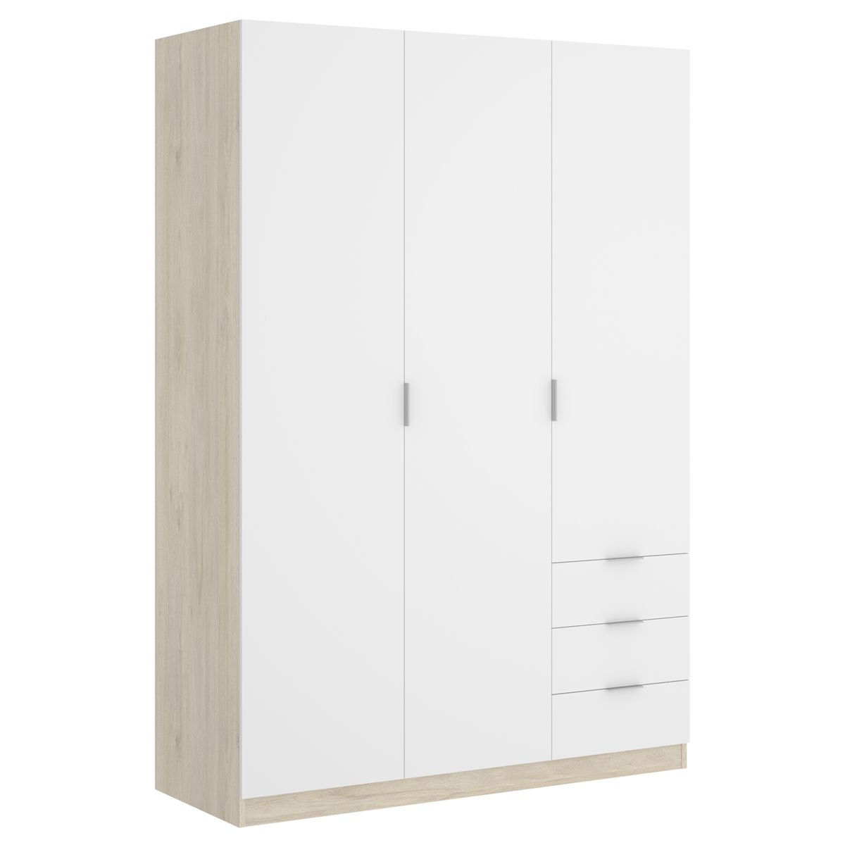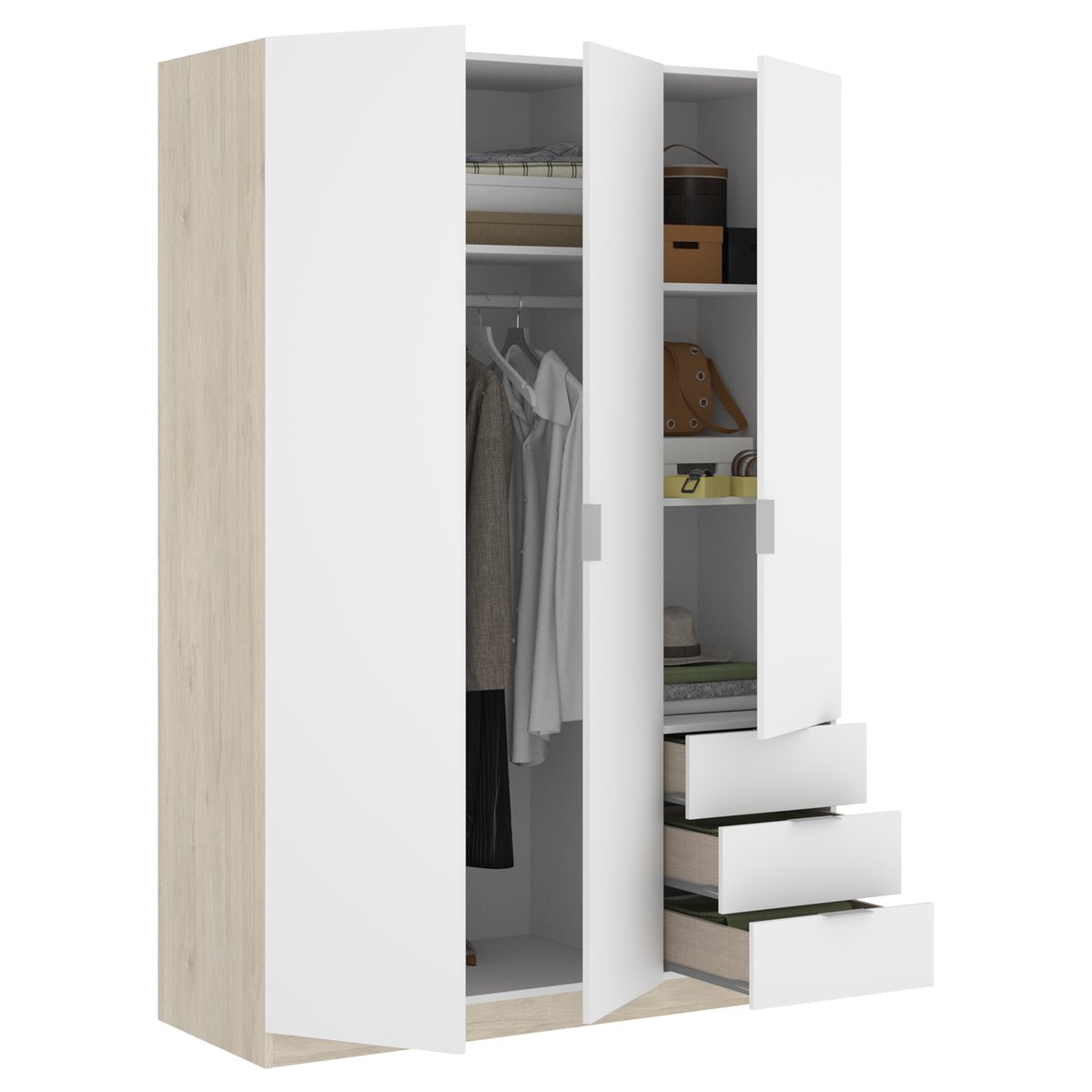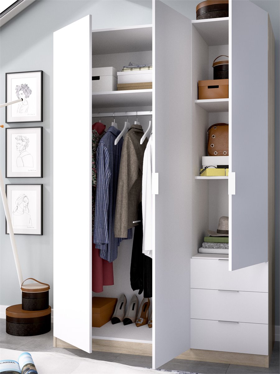 Armario de tres puertas batientes dividido en dos partes: una con una barra y un estante, y otra con dos estantes y tres cajones exteriores. Tirador de Aluminio. Barra de colgar de Aluminio en interior de armario. Tacos ABS quitarruidos y antirrayaduras. Color: Blanco - Roble Natural. Dimensiones: 184 cm (alto) x 121 cm (ancho) x 52 cm (prof.). Requiere montaje. Bisagras metálicas. Incluye todos los herrajes, piezas e instrucciones para su perfecto montaje. Servicio Post venta.
