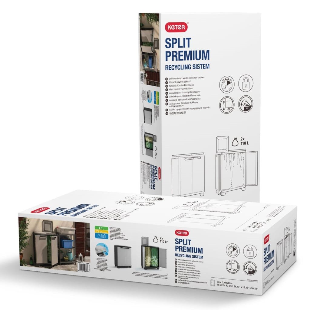 - Capacidad de 2 x 110 l: El armario para reciclar de Keter tiene espacio para dos bolsas de basura de 110 l. (Las bolsas de basura no están incluidas). Coloca las bolsas y empieza a reciclar. El mueble se abre de forma automática al pulsar la tapa.
