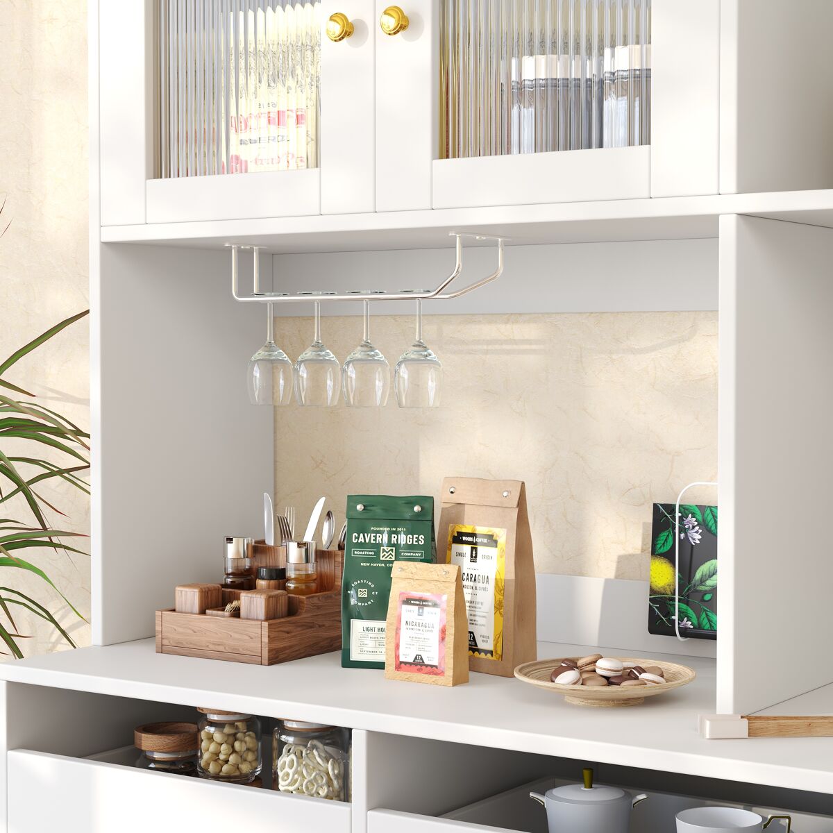 El estante inferior elevado facilita la limpieza y ofrece un almacenamiento multifuncional. El diseño elevado en la planta baja facilita la limpieza y ayuda a mantener el comedor o la cocina ordenados. Diversas opciones de almacenamiento, como separadores abiertos, cajones y botelleros, aprovechan al máximo cada centímetro del espacio para guardar fácilmente diversos platos, utensilios y artículos de uso diario, manteniendo su hogar organizado.