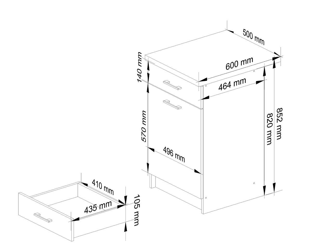El mueble de cocina sobre patas OLIWIA S50 cm 1 cajón 1 puerta con encimera cuenta con 1 cajón y un armario con cerradura que incluye 2 estantes. Todos los muebles de cocina de la serie OLIWIA son productos modulares que se pueden combinar entre sí en diferentes configuraciones. El mueble de cocina sobre patas OLIWIA 50 cm es uno de los muchos elementos que te permiten crear una cocina funcional y moderna. La altura del armario con la encimera es de 85 cm y la profundidad es de 46 cm.
