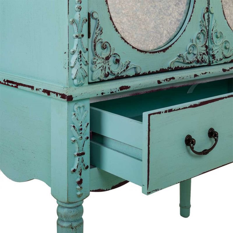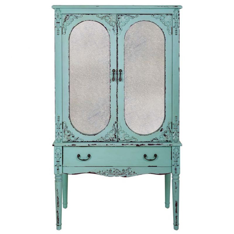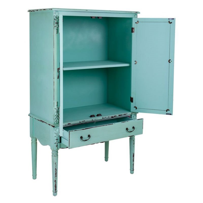 Armario de madera de abeto y MDF de 80x42x140 cm Te sugerimos un armario fabricado en madera MDM y abeto, de color azul turquesa, que cuenta con 2 puertas 1 cajon.