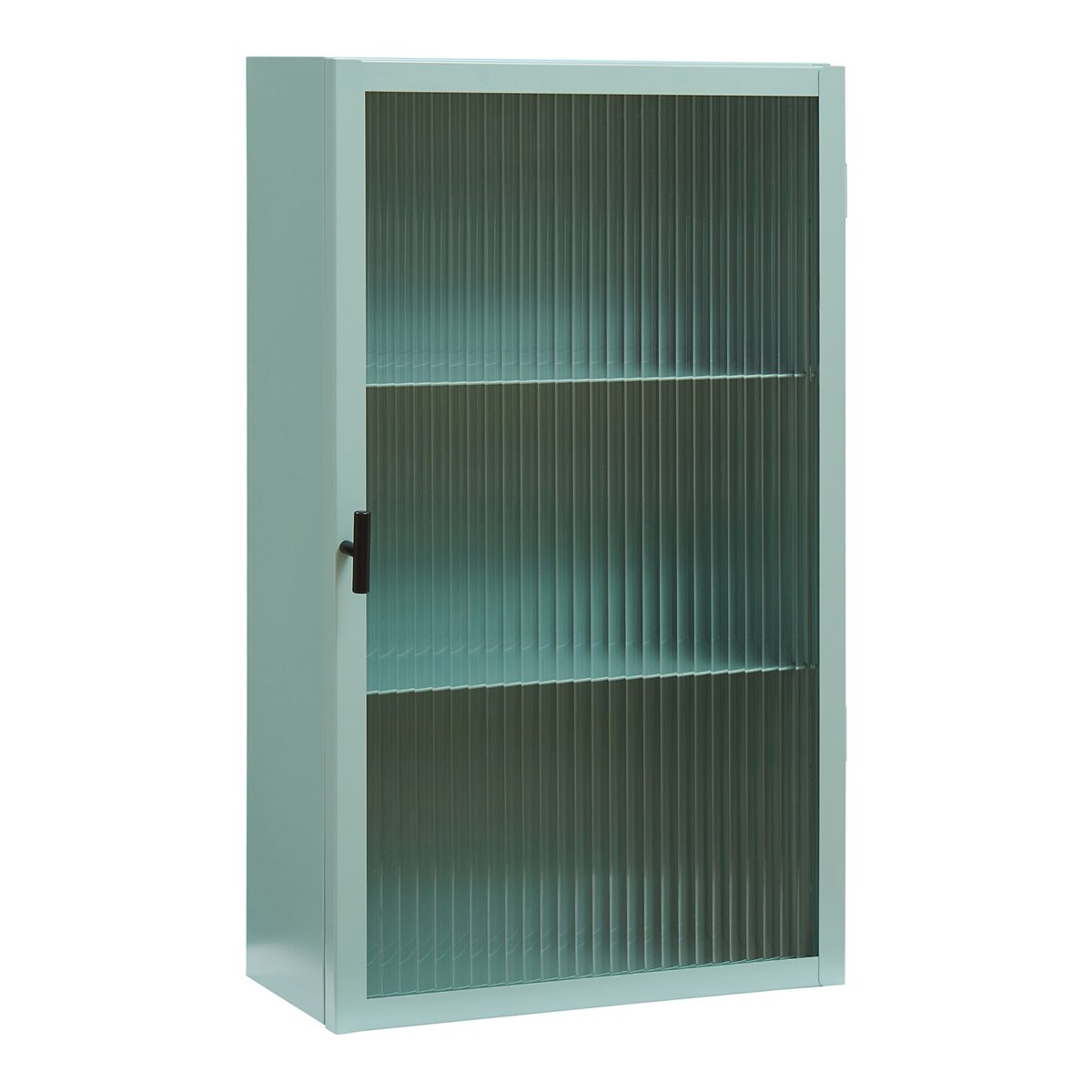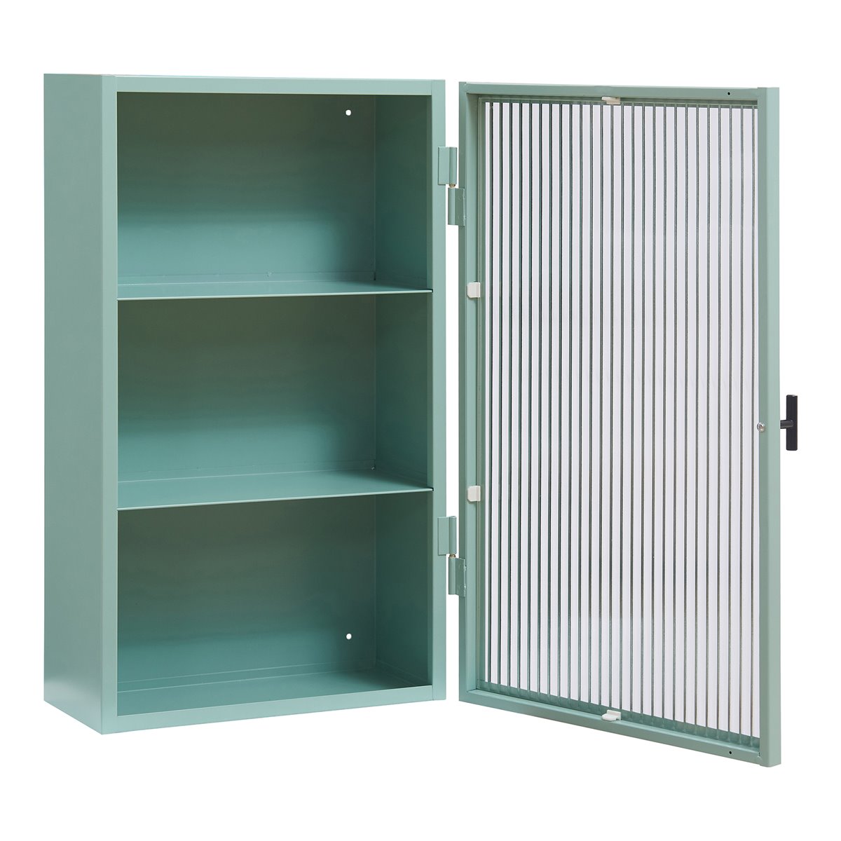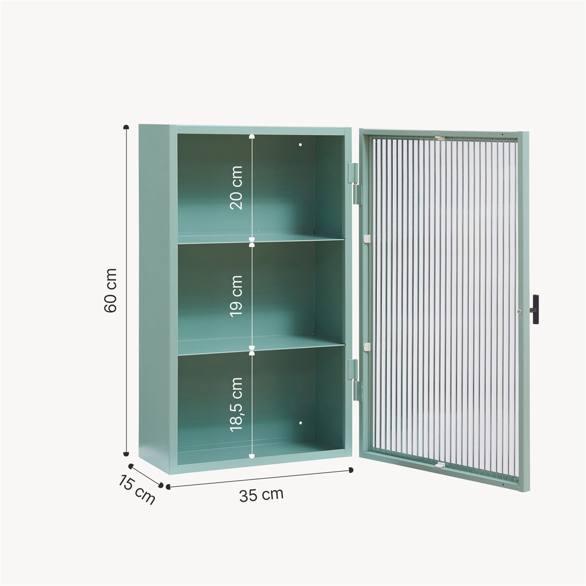 Su puerta de vidrio acanalado guarda tus cosas fuera de la vista y se abre fácilmente gracias a su práctico tirador. Detrás, dos estantes estables ofrecen espacio suficiente para mantener todo bien organizado.