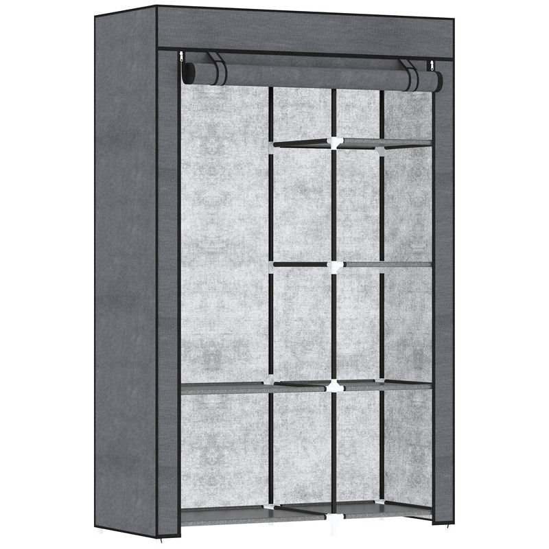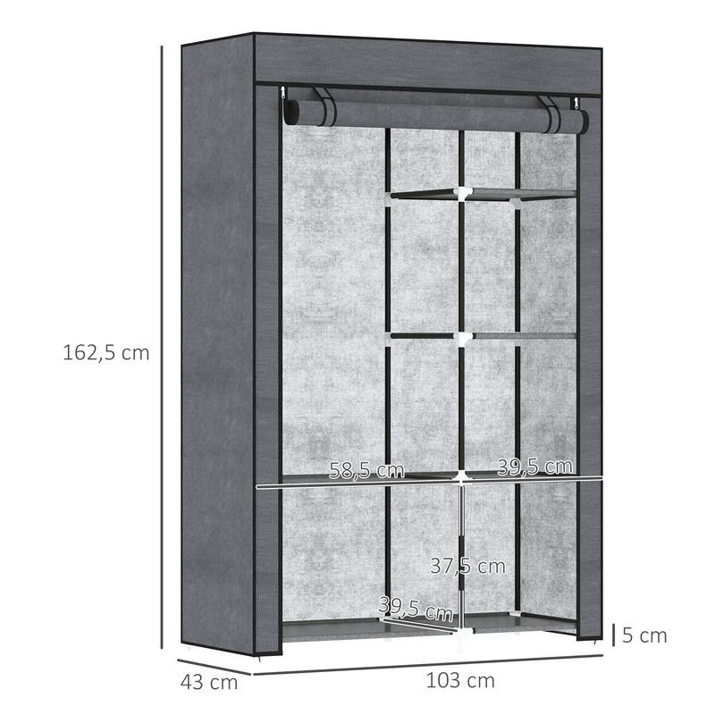 Optimiza el espacio de tu dormitorio con este armario ropero de tela HOMCOM. Con 1 barra para colgar y 6 baldas laterales, es ideal para guardar ropa, toallas, sábanas o bolsos. Su funda de tela no tejida protege contra el polvo y mantiene la ropa limpia. Compacto, resistente y versátil, es la opción perfecta para mantener la casa ordenada con practicidad y estilo.