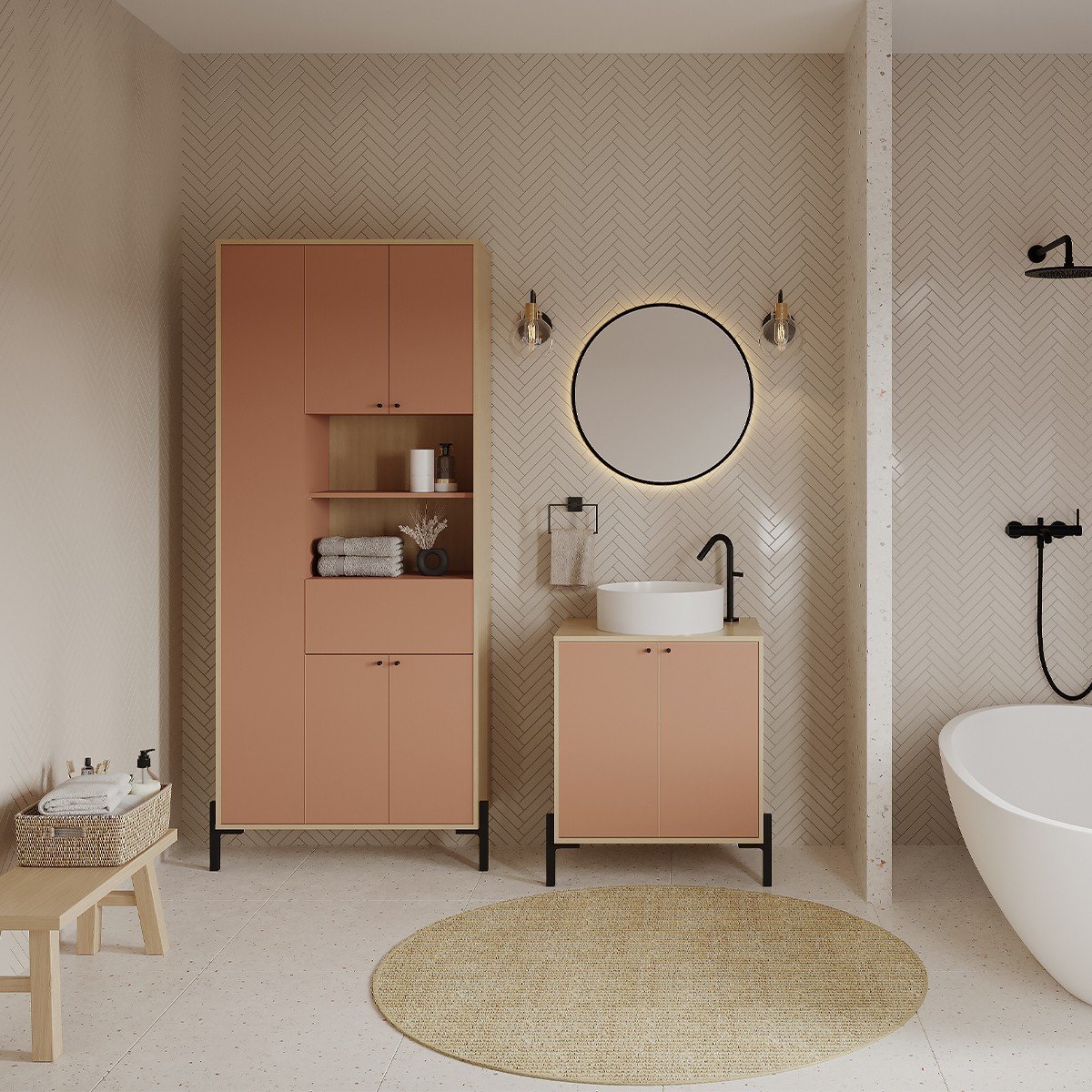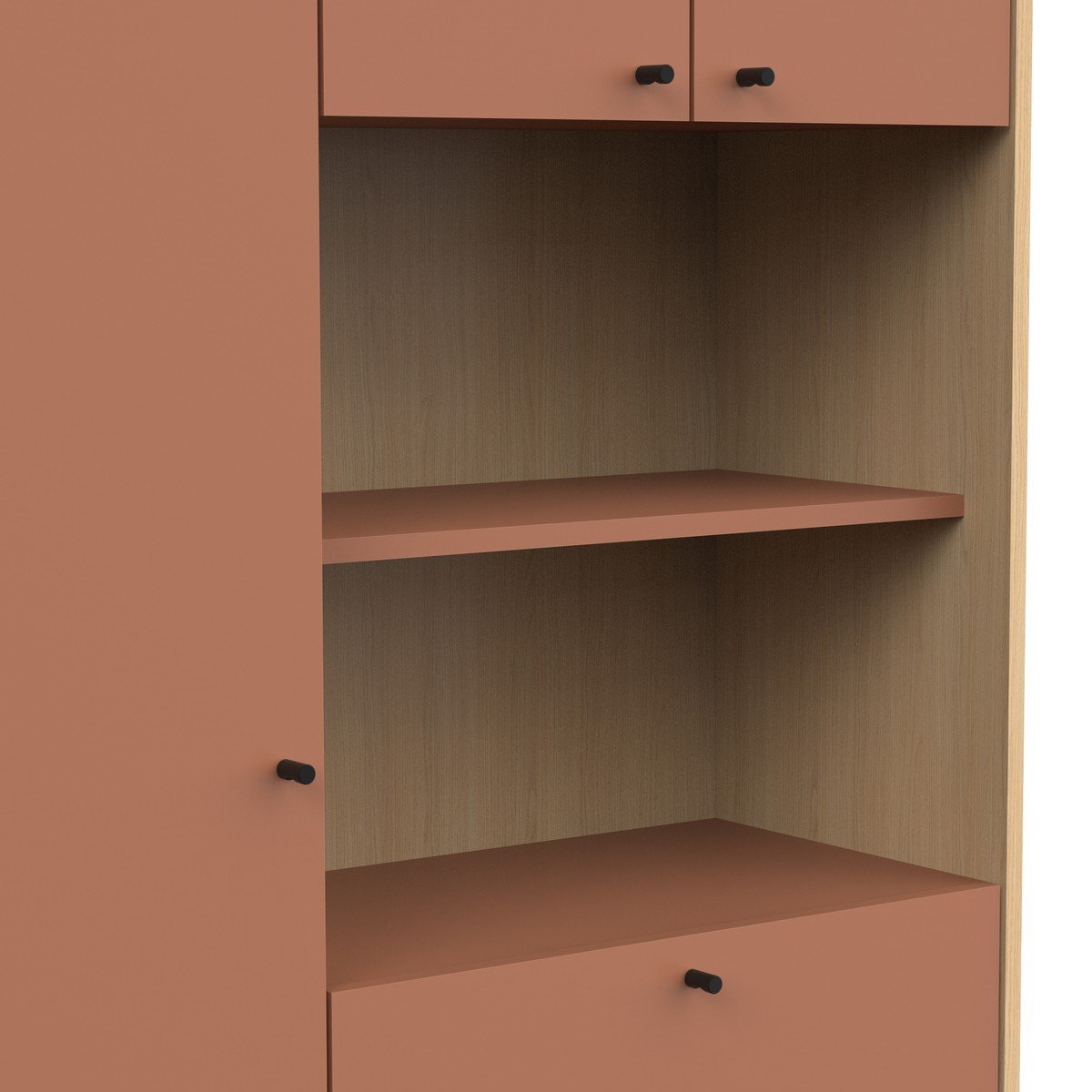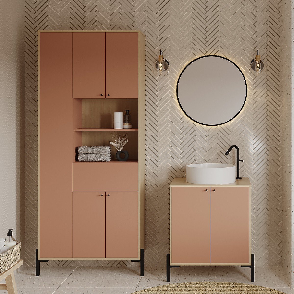 - Columna con 4 puertas, 1 cajón y 2 nichos en paneles de melamina de 15 mm en roble alambrado y terracota.