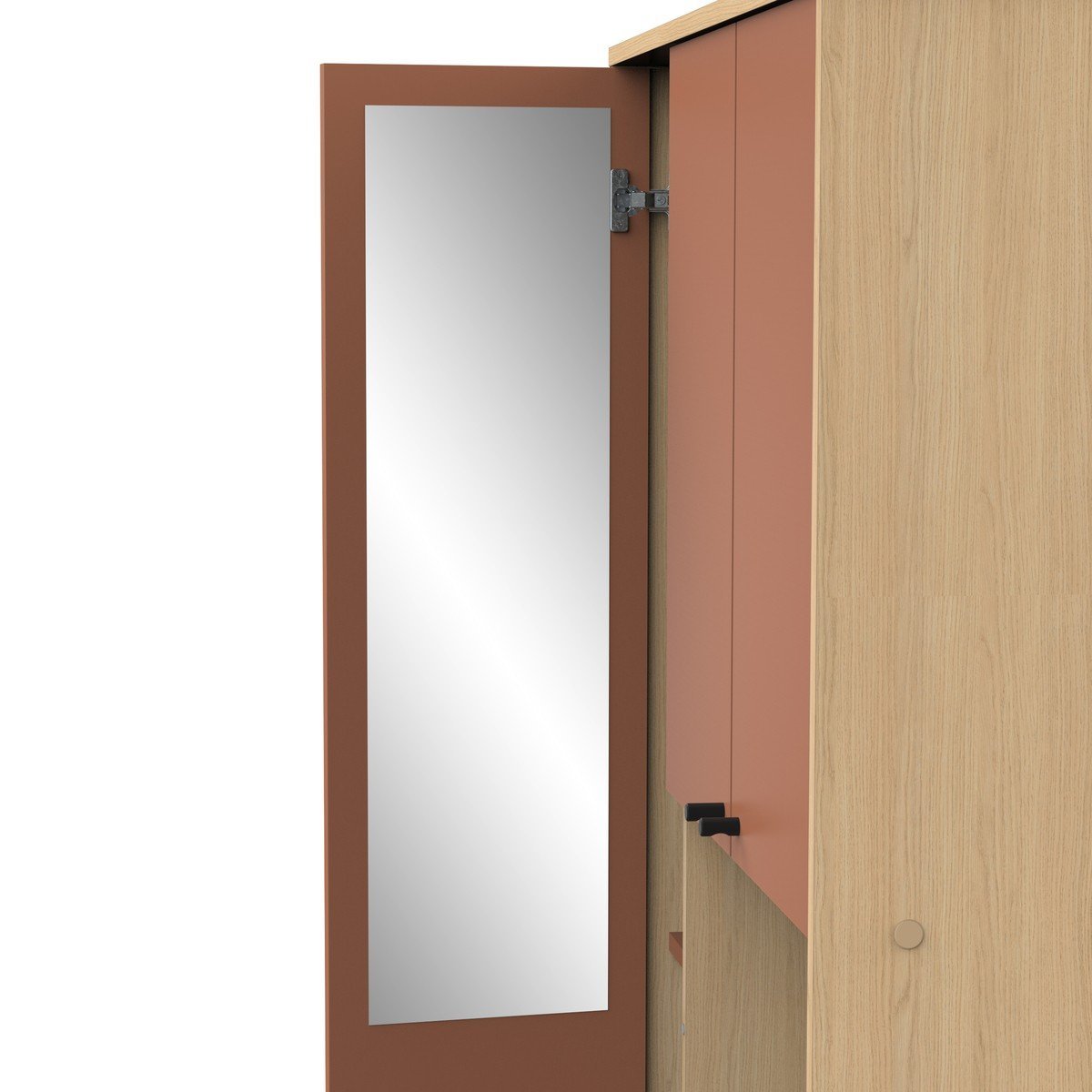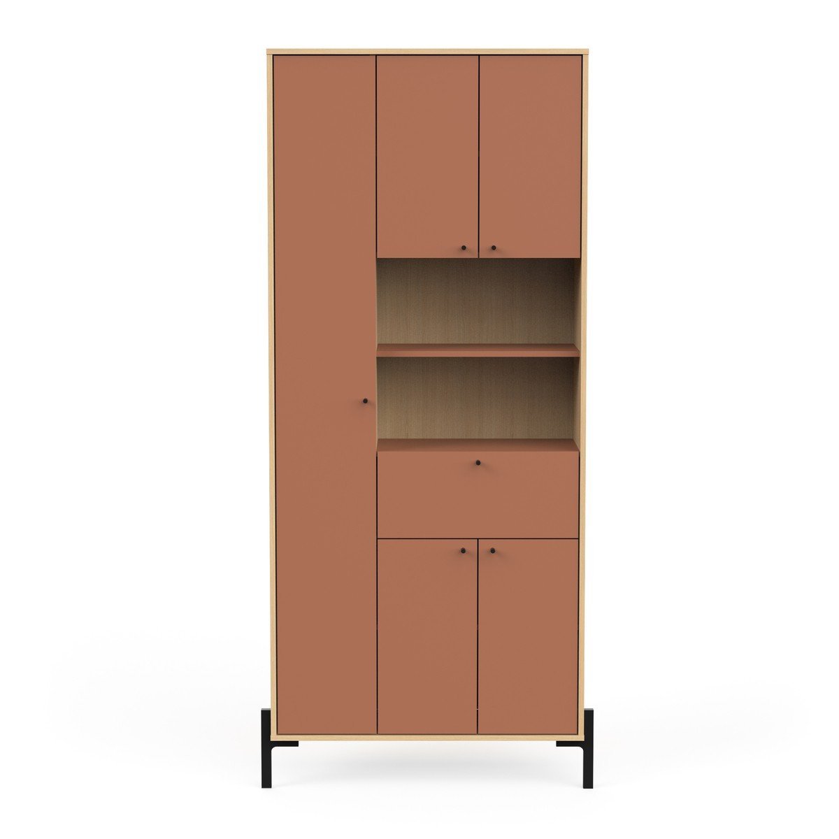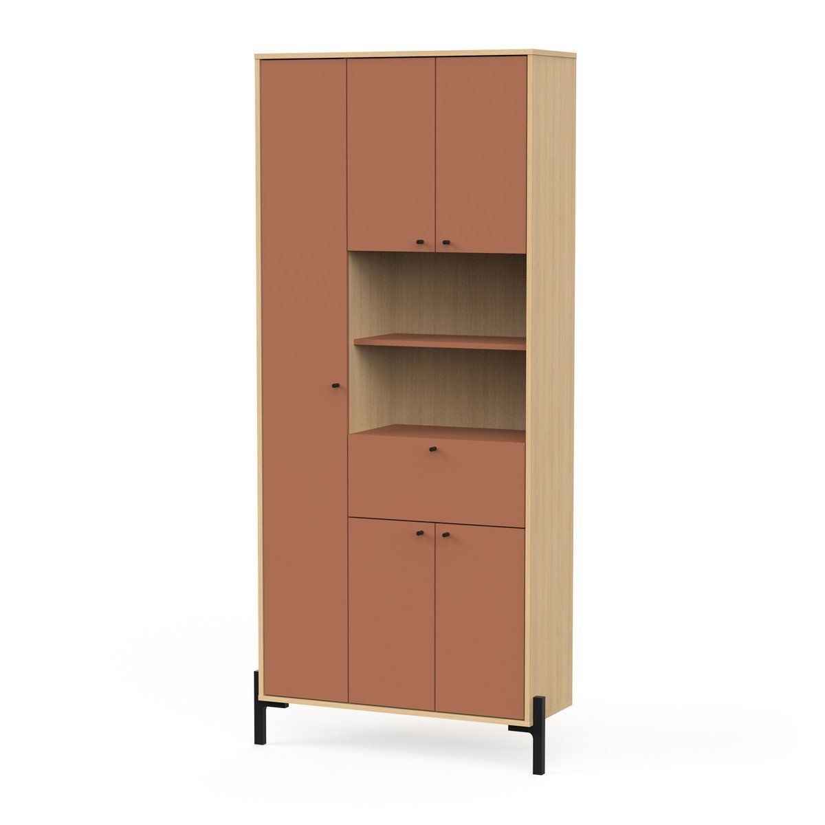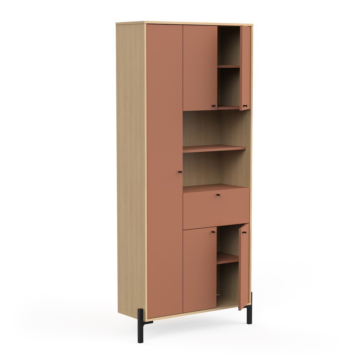 - Columna con 4 puertas, 1 cajón y 2 nichos en paneles de melamina de 15 mm en roble alambrado y terracota.