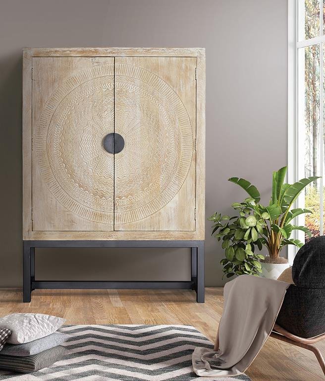 Armario 2 puertas en madera de mango, base y tiradores de metal.