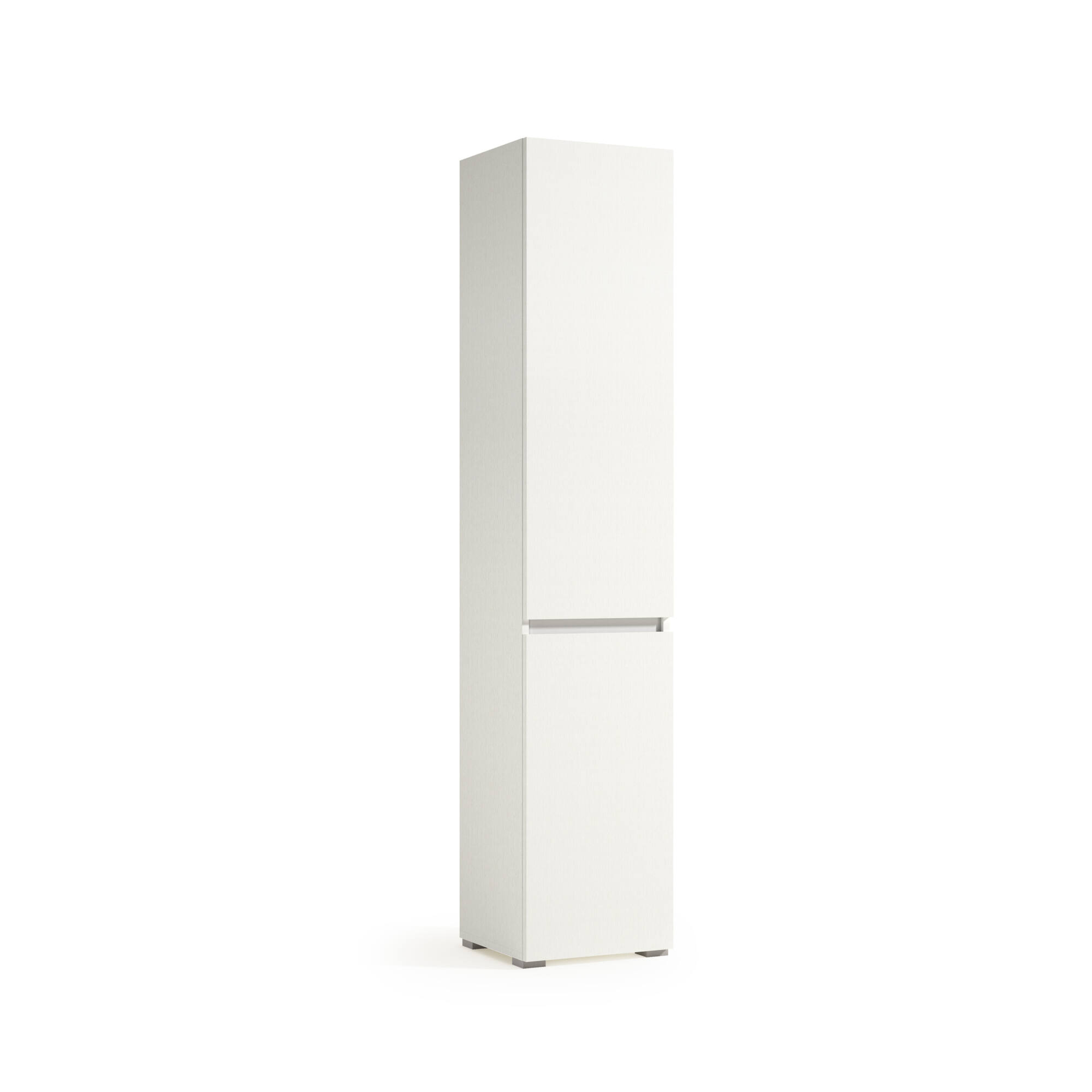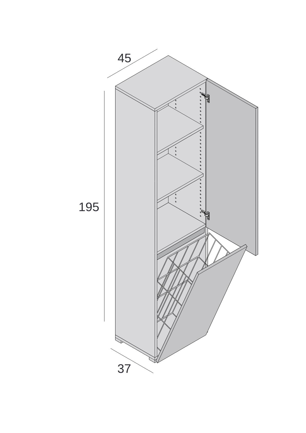 CARACTERÍSTICAS TÉCNICAS - Produto fabricado em painel melamínico, material resistente a impactos e riscos, duradouro e impermeável - Roupeiro equipado com sistema de fecho push-pull para a porta superior e guias metálicas telescópicas para o compartimento inferior - Artigo de decoração equipado com dobradiças metálicas e travas em ABS anti-ruído e anti-riscos na parte inferior do móvel - Cesto de arrumação ou cesto de roupa incluído - Limpeza rápida e fácil graças ao material de que é feito - Fornecido desmontado com kit e montagem manual de instruções - Particular cuidado e atenção à embalagem, resistente e adequada ao transporte - Painel melamínico certificado FSC, a espessura de 18 mm garante elevada resistência dos materiais, elevado resultado estético graças ao acabamento de altíssima definição - Peso máximo suportado para cada prateleira : 10 Kg DIMENSÕES EM CM, Roupeiro multiusos: Comprimento: 45 Largura: 37 Altura: 195