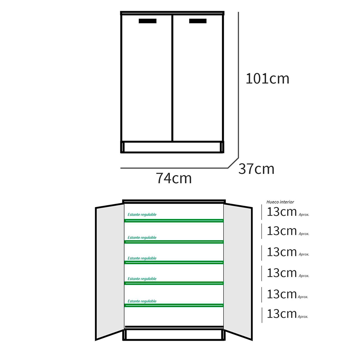 - Dimensiones: La medida de este mueble auxiliar zapatero es de 74 cm de ancho, 101 cm de alto y 36 cm de fondo. Las baldas miden 70 cm de ancho x 30 cm de fondo.