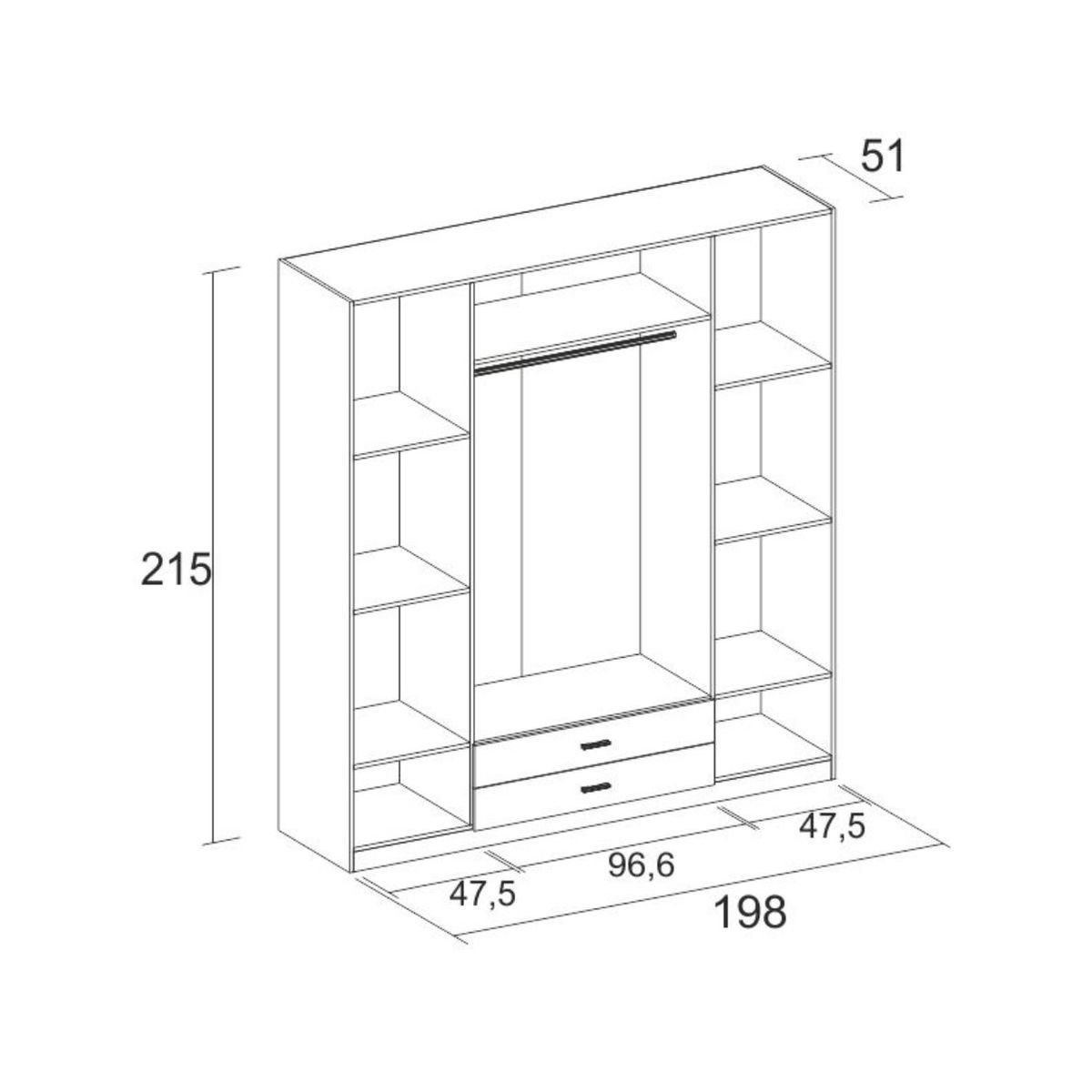 Descubre el armario modelo Roma, una opción funcional y con estilo para completar tu dormitorio o vestidor. Diseñado con cuatro puertas y dos cajones de gran capacidad, te permitirá organizar y guardar toda tu ropa de forma práctica y ordenada. En sus laterales incluye cuatro compartimentos abiertos, ideales para colocar zapatos, cajas organizadoras o incluso ropa doblada que necesites tener a mano. La parte central incorpora una barra para colgar perchas, perfecta para camisas, chaquetas o vestidos, así como un altillo superior que resulta muy útil para guardar mantas, edredones o prendas de temporada.