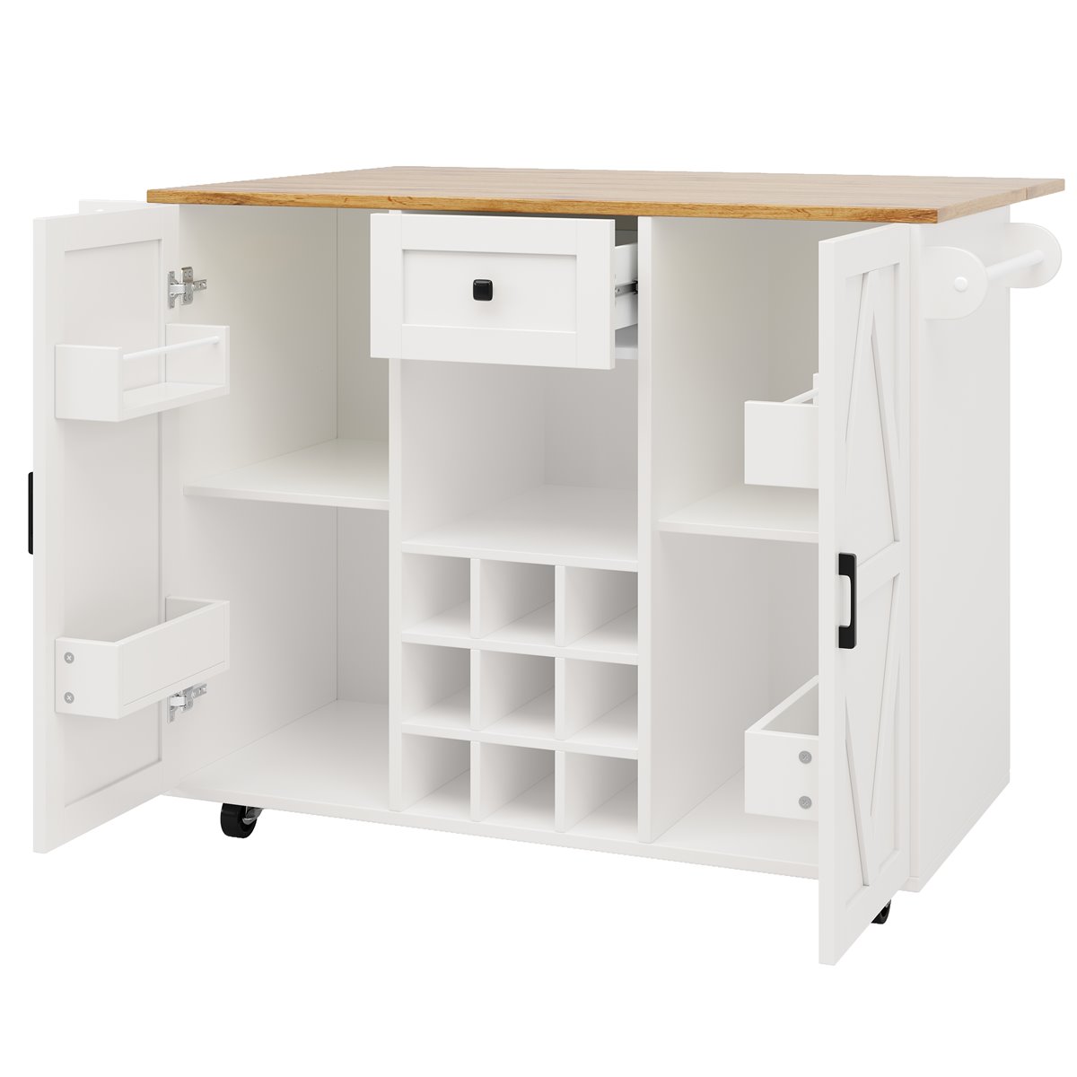 - Diseño Multifuncional: Esta isla de cocina moderna incluye una mesa plegable, que se puede usar como comedor o como espacio de almacenamiento. Su diseño innovador le permite adaptarse a las necesidades de las cocinas pequeñas.