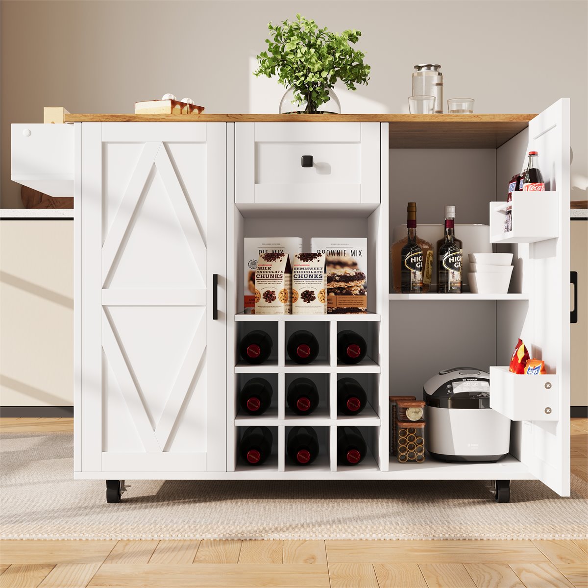 - Amplio espacio de almacenamiento: Cuenta con 1 cajón, 2 estantes laterales y un armario de 2 puertas con un compartimento extraíble para vino y un estante para bocadillos. Las particiones ajustables permiten una organización flexible para utensilios, especias, vino, bebidas, entre otros.