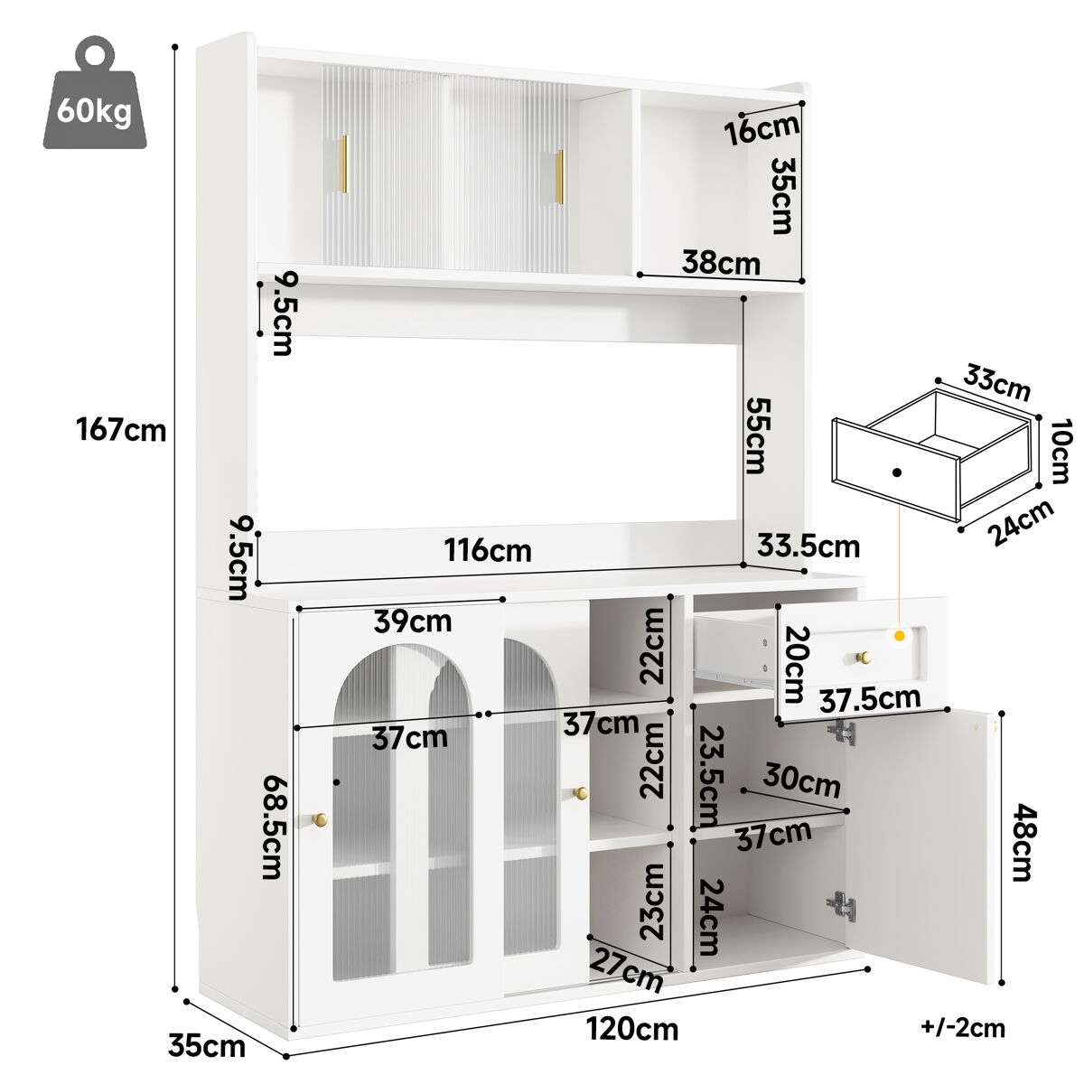 - Amplio espacio de almacenamiento con estantes ajustables, ideal para almacenar artículos de diferentes tamaños. La superficie superior ofrece espacio adicional para electrodomésticos de cocina.