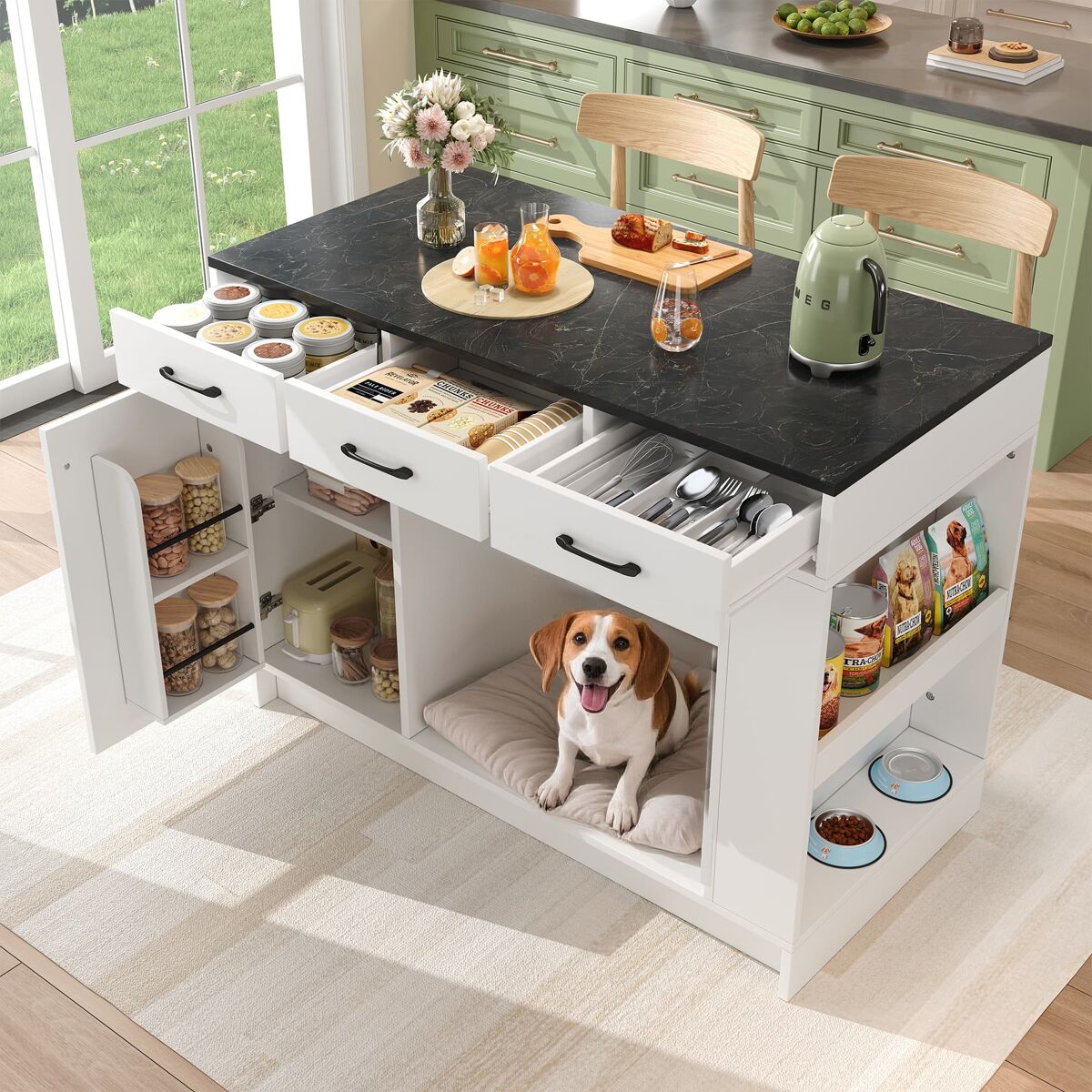 - Gran área para mascotas: permite colocar cama de perro o gato, ofreciendo un espacio exclusivo mientras cocinas o comes.