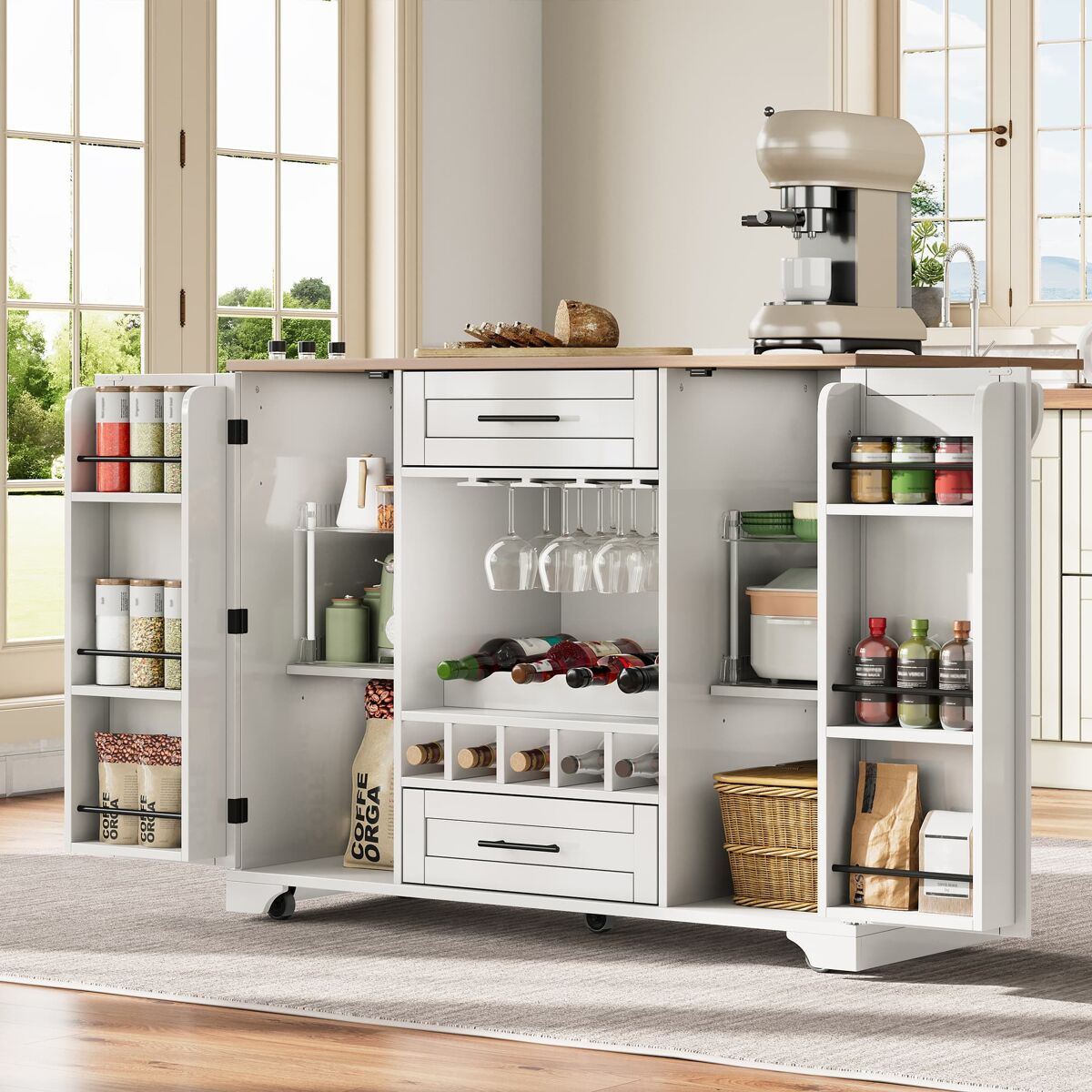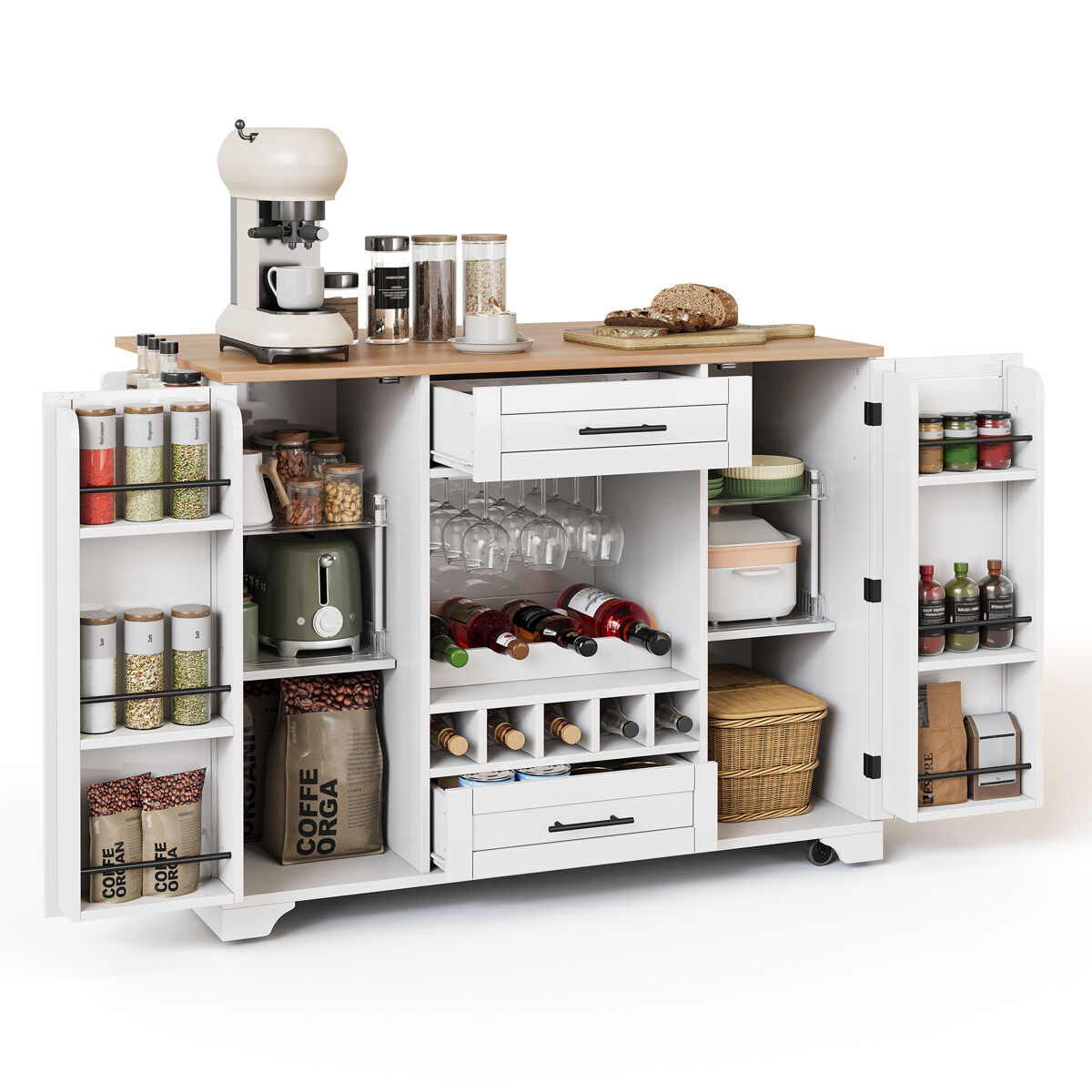 - Incluye dos grandes armarios con estantes ajustables, un soporte para copas de vino y un estante para especias.