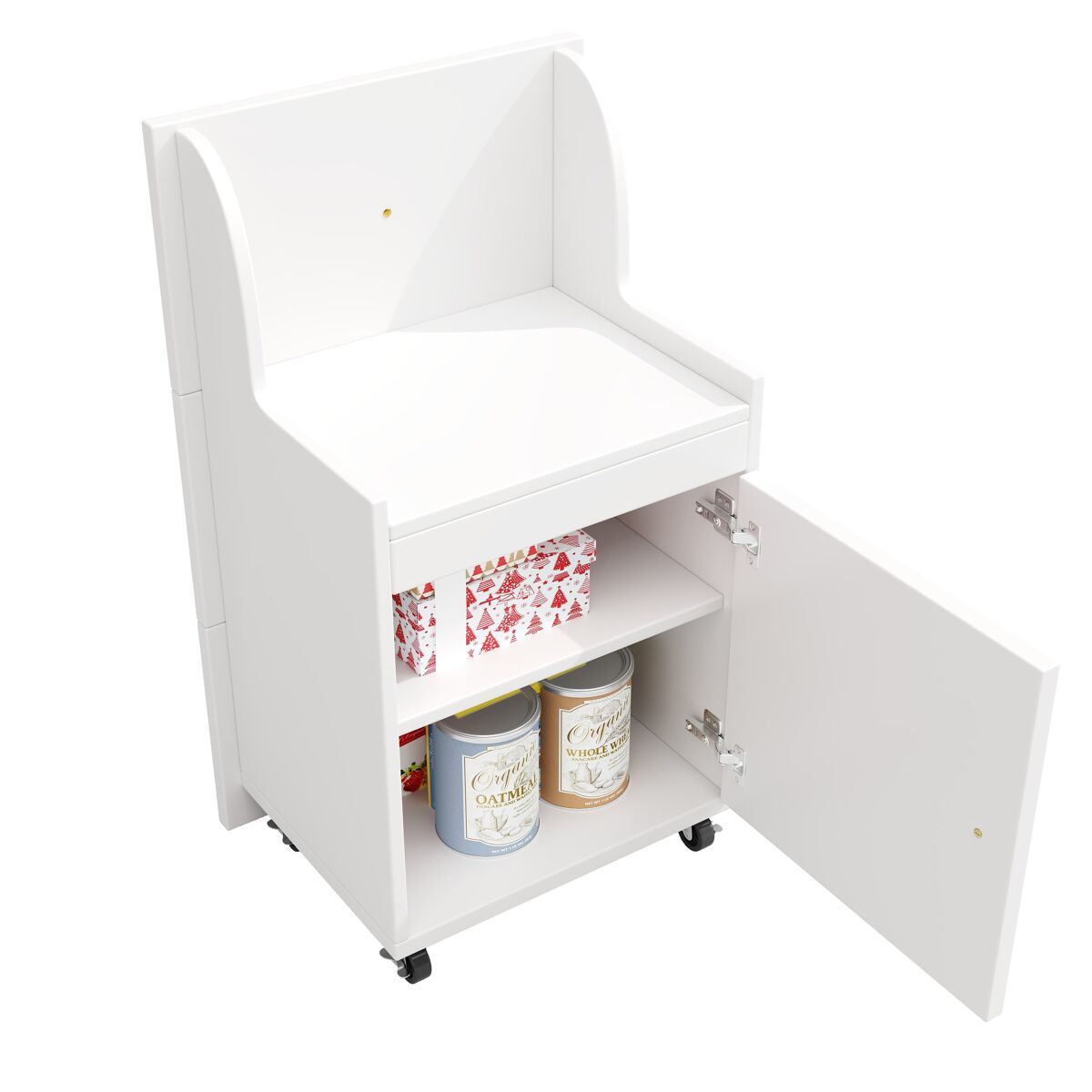 - Incluye dos taburetes acolchados con almacenamiento interno de dos niveles, totalmente guardables bajo la encimera y con ruedas para movilidad fácil.