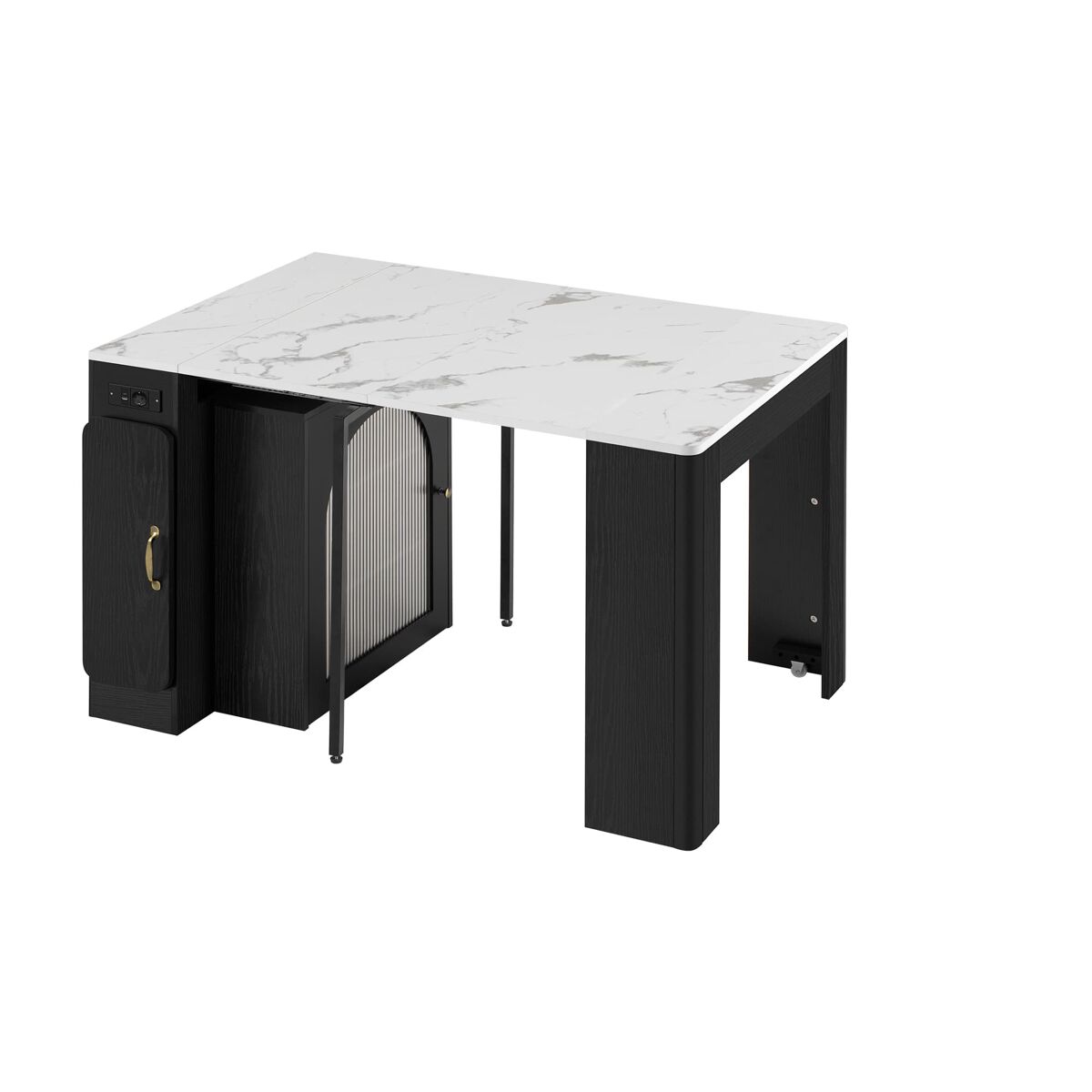 - Diseño moderno y versátil: La combinación de la mesa de comedor en blanco con imitación de mármol y el cuerpo del mueble en negro con vetas de madera ofrece un contraste visual llamativo. Los detalles como los tiradores de bronce y el vidrio estriado destacan la calidad artesanal.