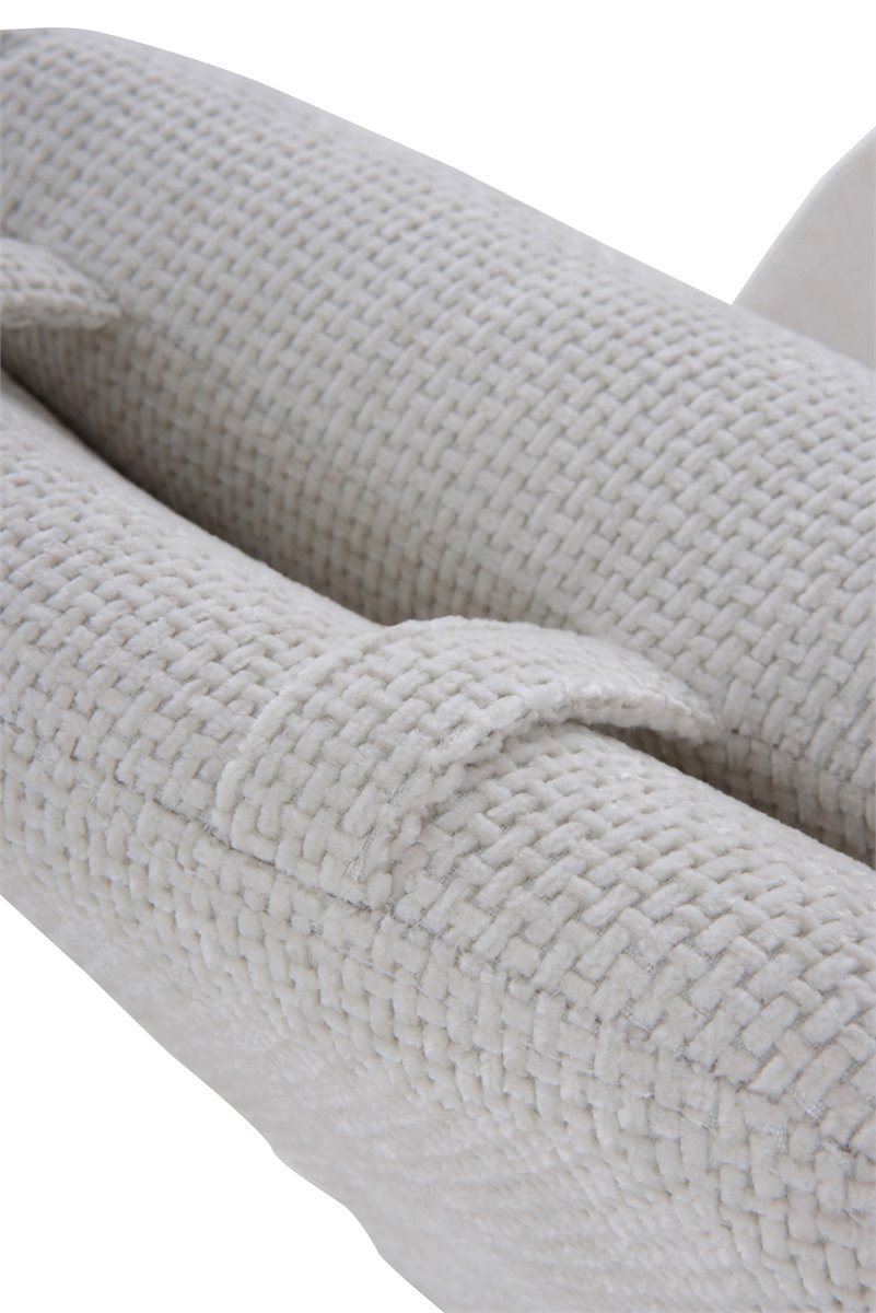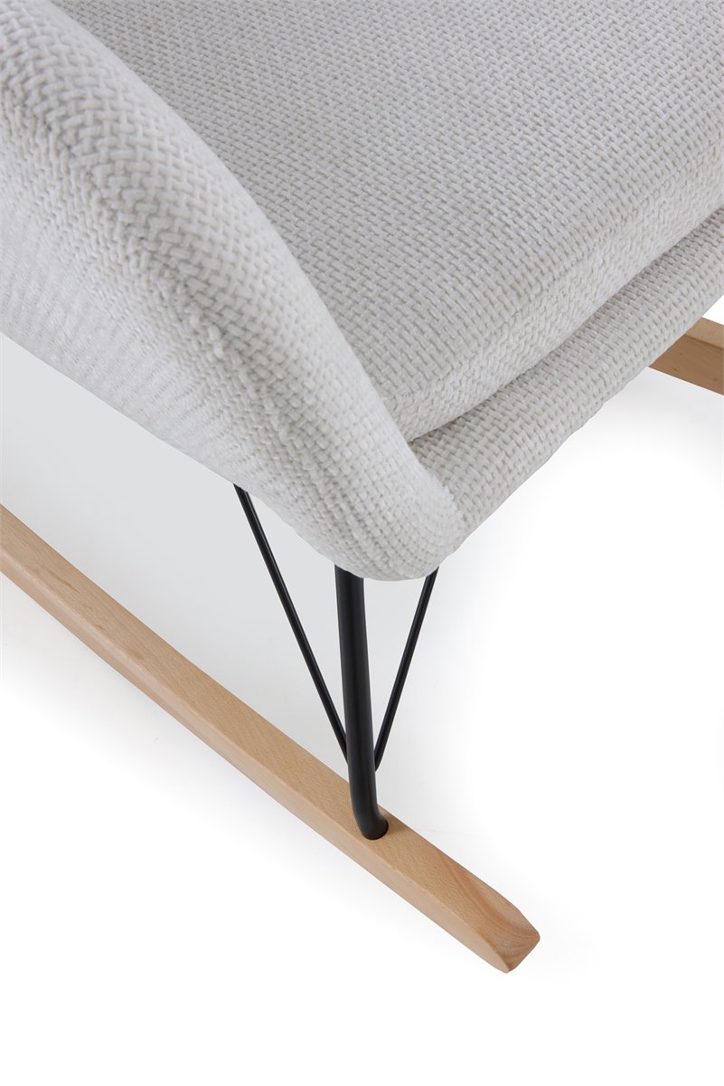 El balancín tapizado en chenilla blanca cuenta con patas metálicas y patín de madera de haya. El tejido tapizado es 100% poliéster chenilla de tacto suave, y los patines son de madera de haya con protección para evitar rayaduras. El asiento es desenfundable mediante cremallera, la altura del asiento de 50 cm, la altura de respaldo de 72 cm y la altura de brazo de 61 cm. Requiere montaje.