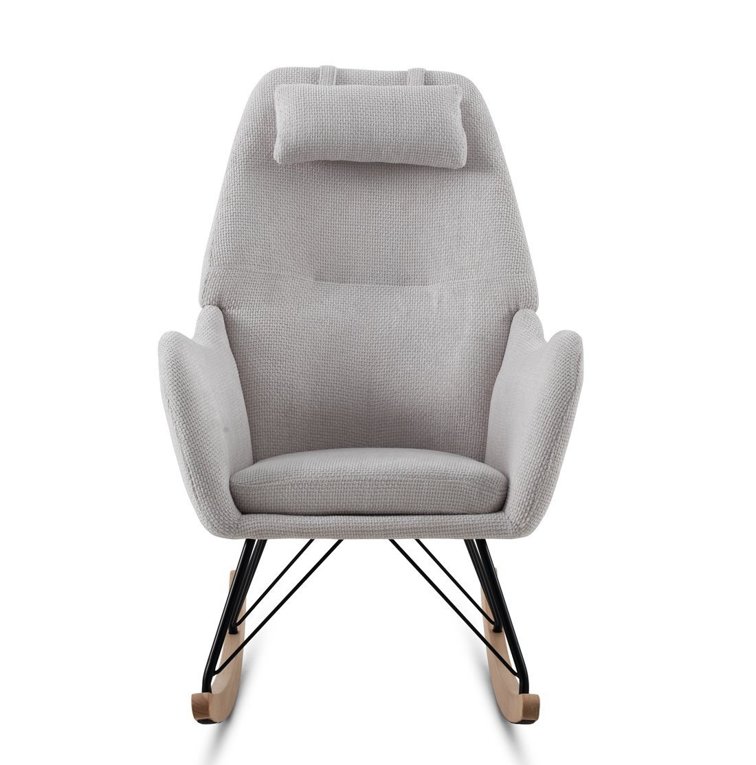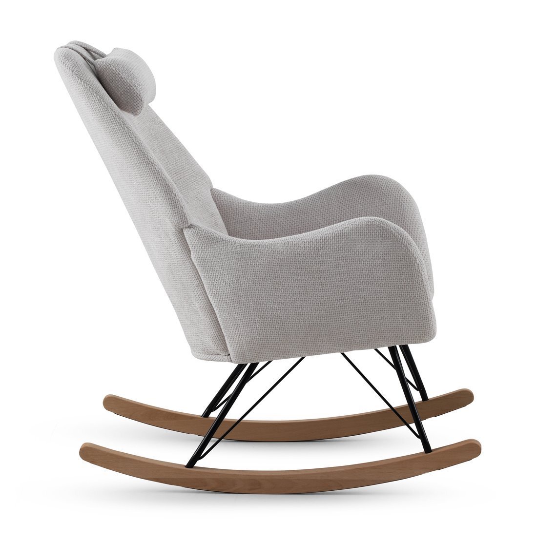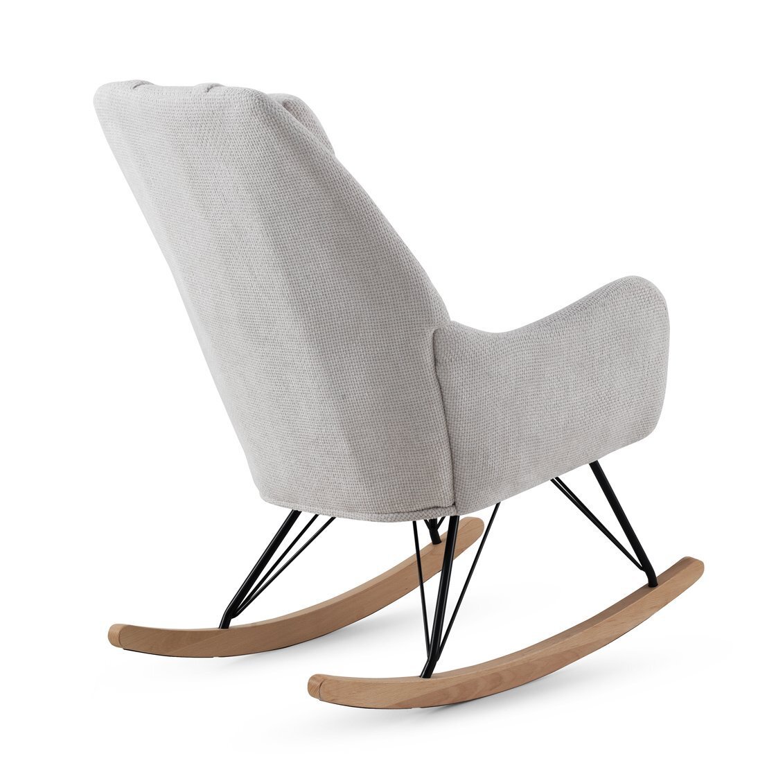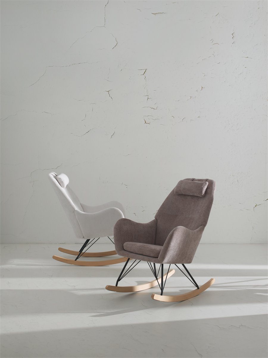 El balancín tapizado en chenilla marrón claro cuenta con patas metálicas y patín de madera de haya. El tejido tapizado es 100% poliéster chenilla de tacto suave, y los patines son de madera de haya con protección para evitar rayaduras. El asiento es desenfundable mediante cremallera, la altura del asiento de 50 cm, la altura de respaldo de 72 cm y la altura de brazo de 61 cm. Requiere montaje.