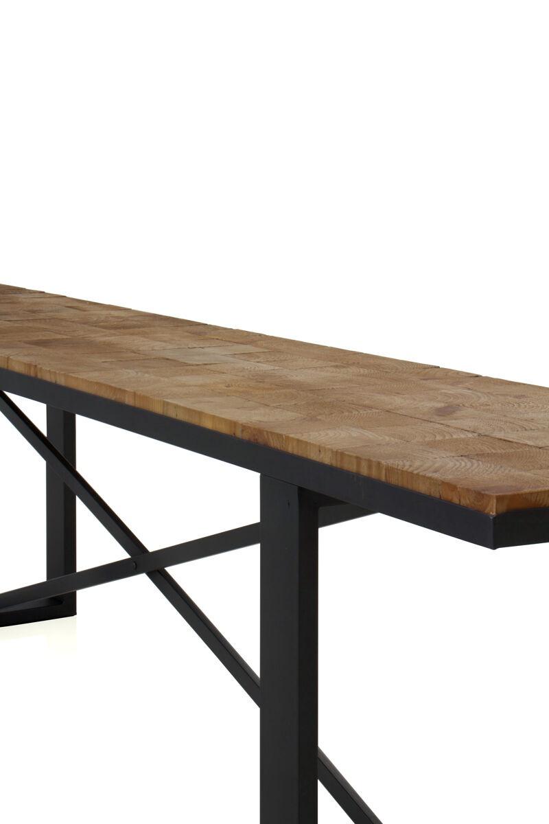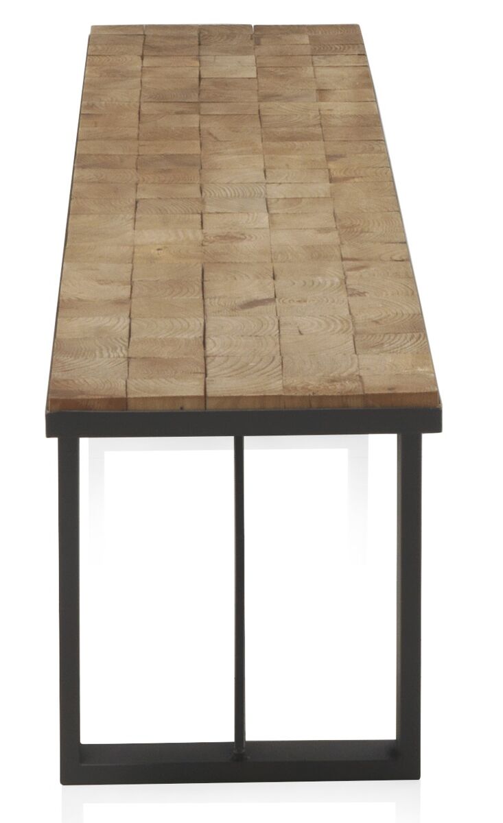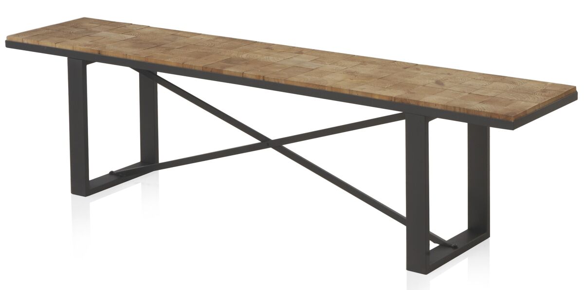Un banco de 175 cm con un asiento formado por bloques cuadrados de madera de abeto reciclada de color natural encolados de forma geométrica, las patas son de metal negro.