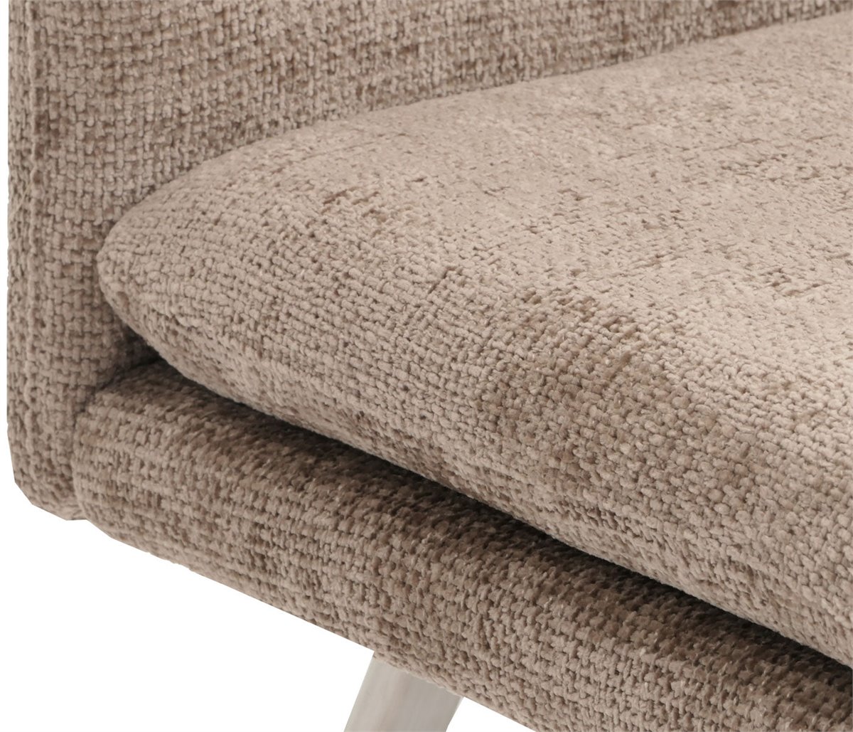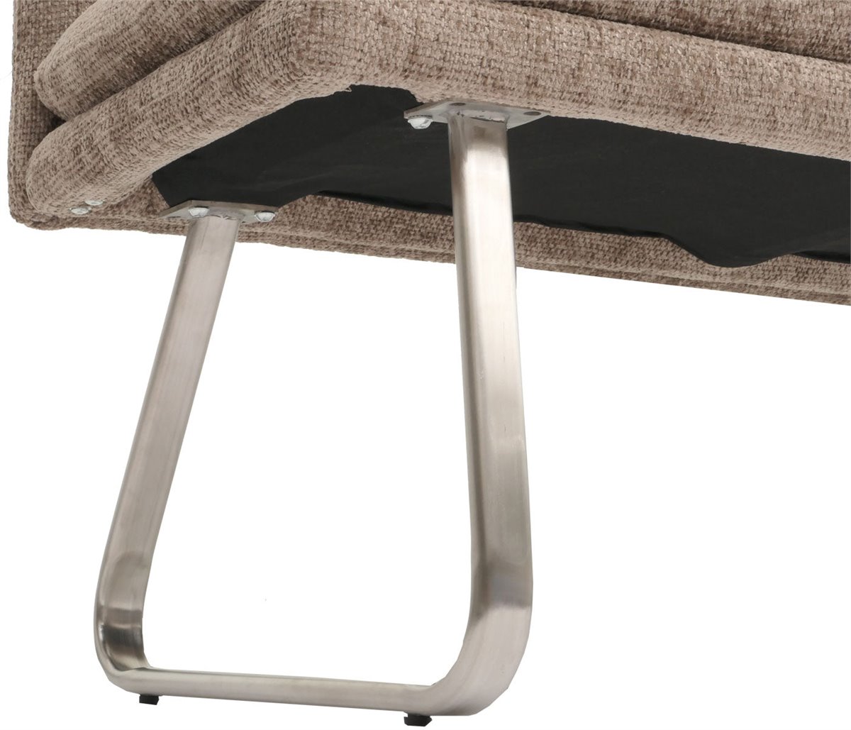 El banco impresiona por su moderno revestimiento de chenilla, sus elegantes costuras decorativas y sus bordes redondeados. Ofrece espacio para tres personas, un cómodo respaldo y descansa sobre patas de acero inoxidable cepillado con protectores de suelo ajustables.