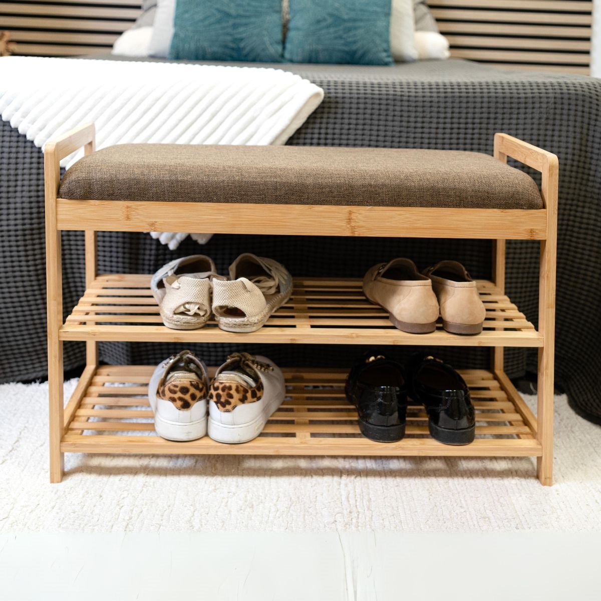 Descubre el encantador banco zapatero ideal para mantener en orden tu calzado y el de tu familia. Con el MOA de Vinthera podrás tener a mano tus zapatos en todo momento. Perfecto para situarlo en cualquier lugar de tu hogar, es super práctico para situarlo en la entrada junto a la puerta. Su asiento acolchado es de lo más cómodo y práctico, podrás sentarte y ajustarte tu calzado con la mayor comodidad posible. Fabricado en bambú ultra resistente, este banco zapatero es capaz de soportar hasta 70kg de peso en su asiento y 5kg en cada una de sus baldas.