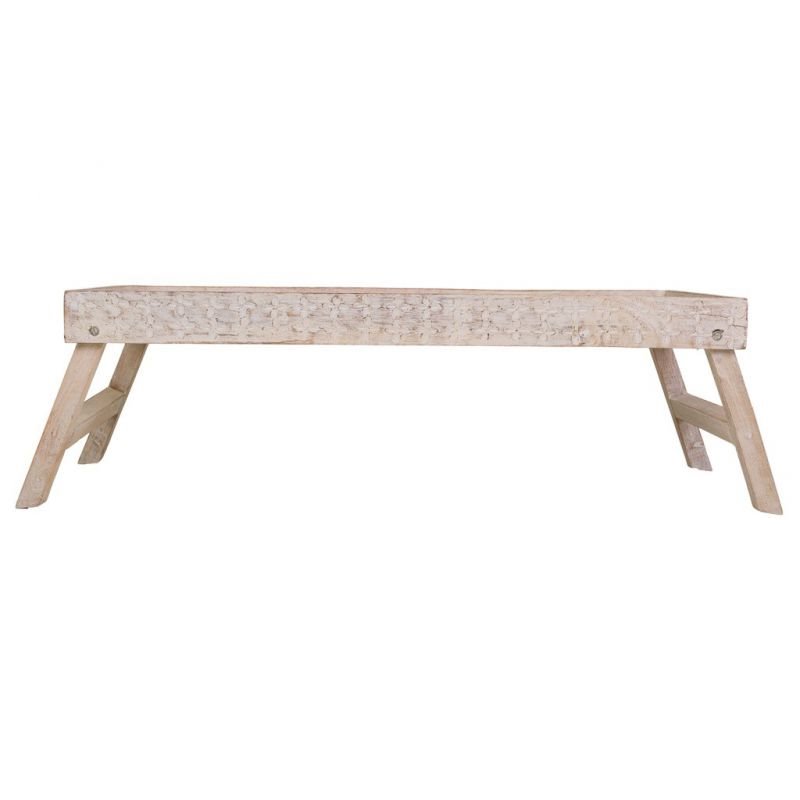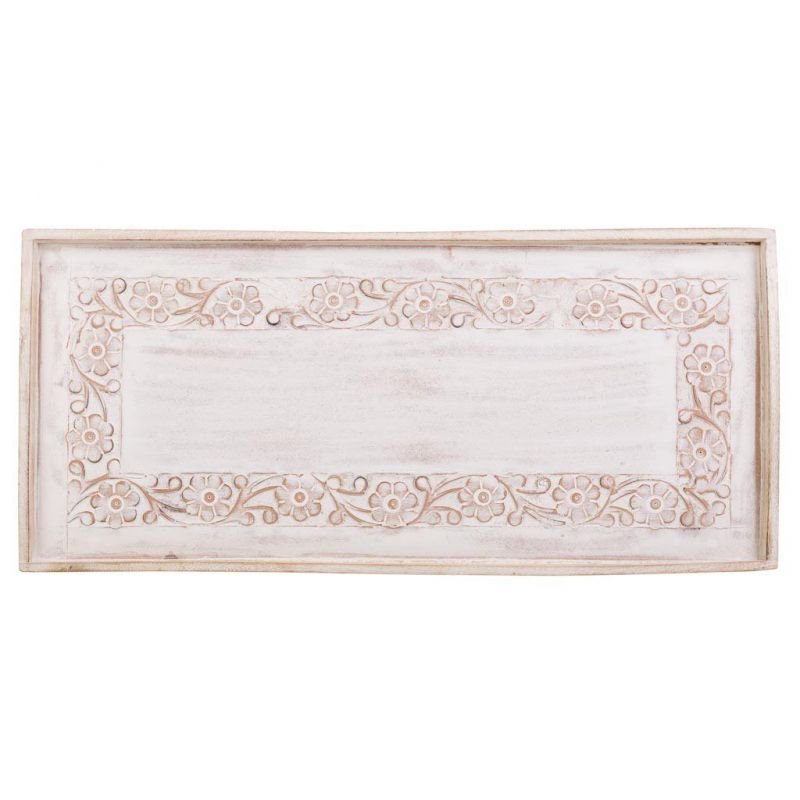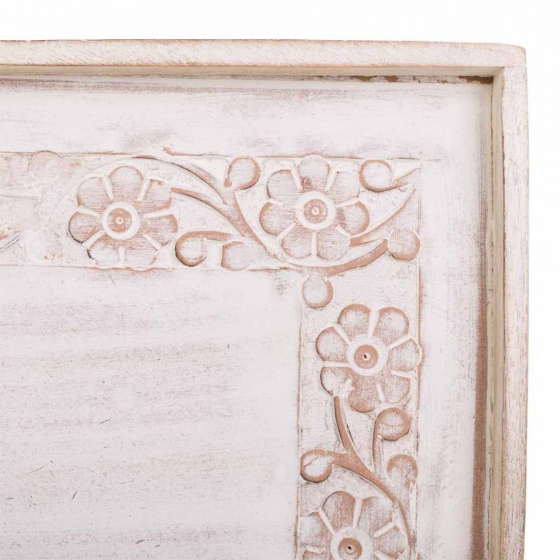 Esta elegante bandeja de desayuno de madera tallada cuenta con un acabado artesanal en blanco que añade un toque de sofisticación a tus momentos de relajación.