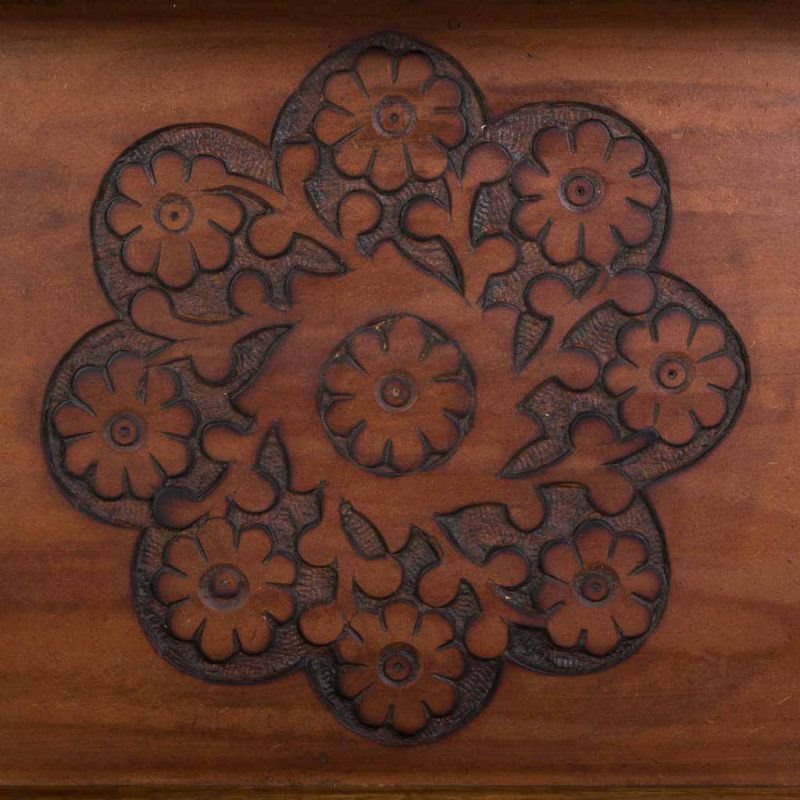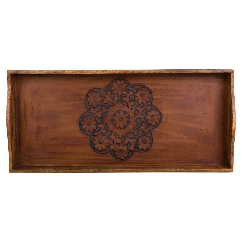 Esta encantadora bandeja de desayuno de madera tallada tiene un acabado artesanal en marrón que le da un toque rústico y auténtico.